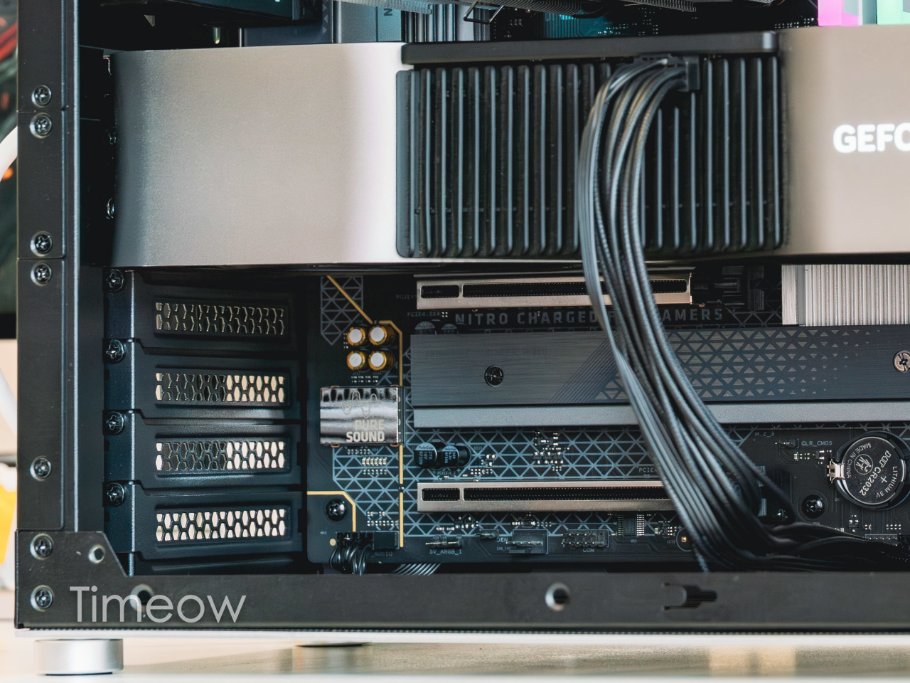 另外,它的PCIe 5.0x16显卡接口设计在SSD的M.2接口上方,即使我用了超厚的三槽厚显卡,也不会挡住第二个PCIe4.0接口,需要安装万兆网卡、声卡等扩展卡时不会尴尬。而且这三个接口都用了金属加固,减少了撅断的风险。