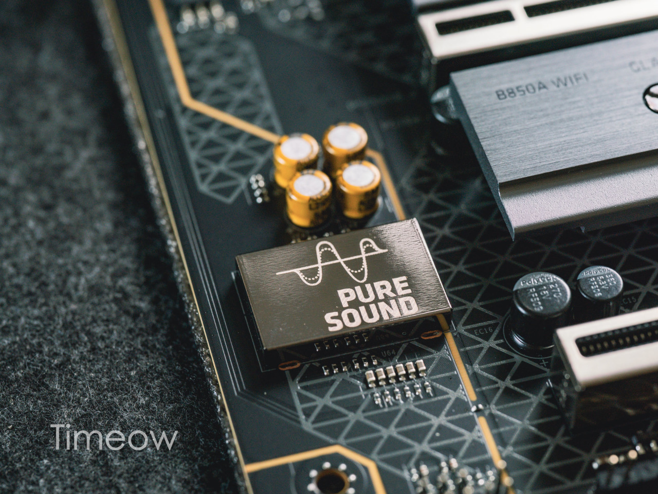 它在主板上配备了支持5.1的Realtek ALC897高保真解码芯片(Pure Sound屏蔽罩下方),配合专用电容,声音输出还是很优秀的。