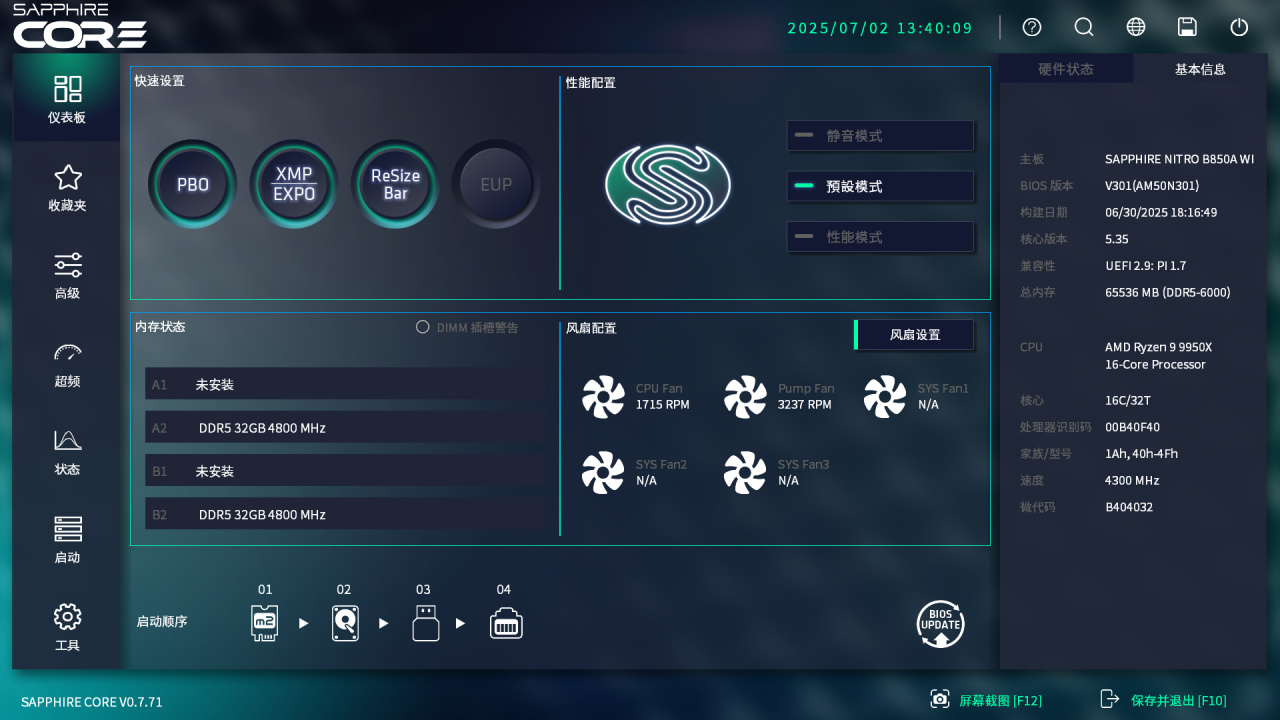 主板:蓝宝石NiTRO+氮动B850A WIFI