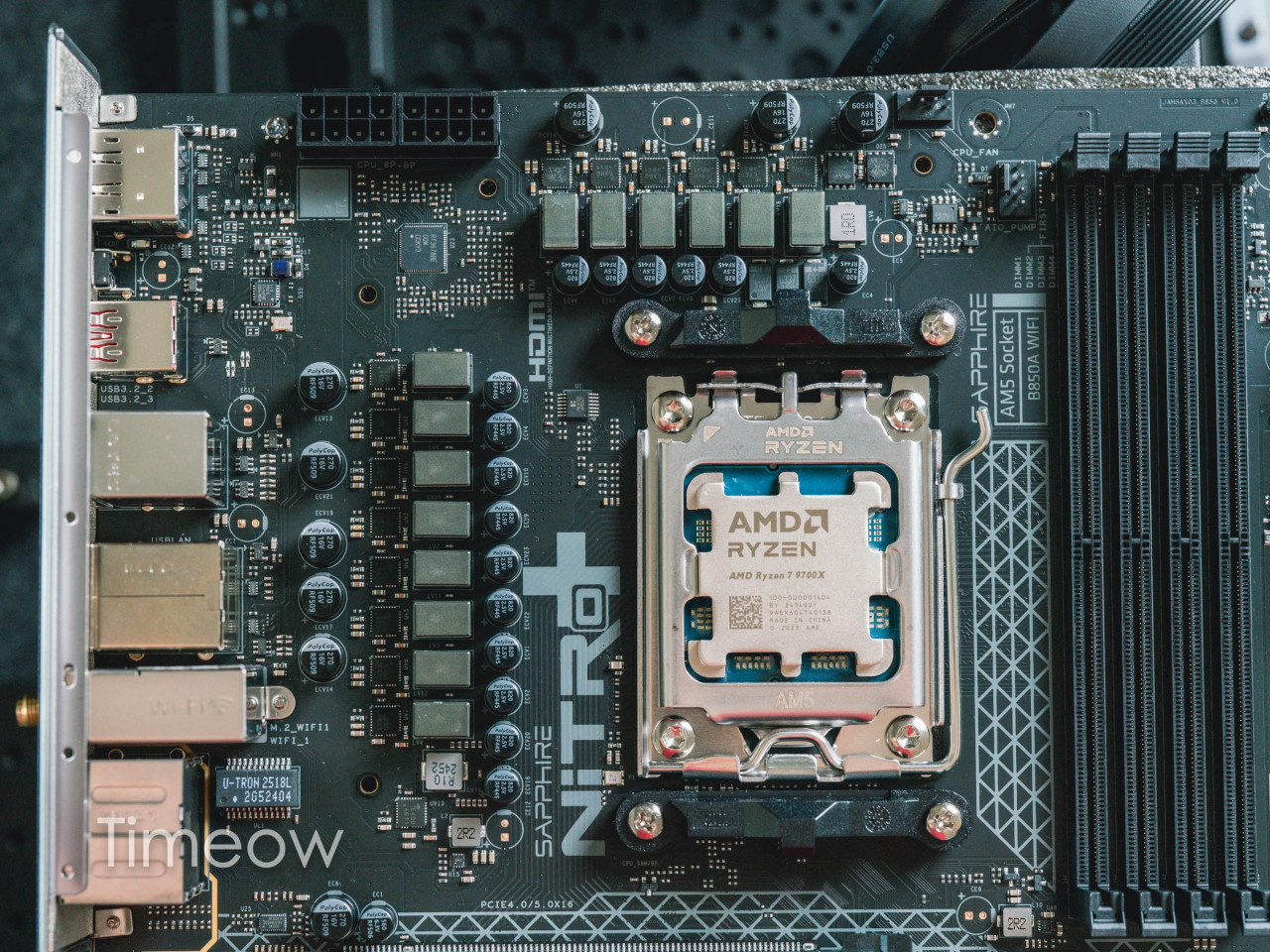拆下散热器后就能看到它的供电部分了,蓝宝石NiTRO+氮动B850A WIFI给到了12+2+1路智能供电的豪华配置,每相配备55A Dr.MOS,配合两个8Pin接口的CPU供电,可以说所有锐龙处理器都能得到完整的性能释放。