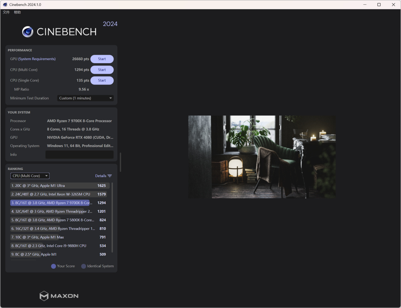 在Cinebench 2024中,单核跑分135,多核跑分1294。成绩比我的冰雕跑出的单核130,多核1233要好一些。