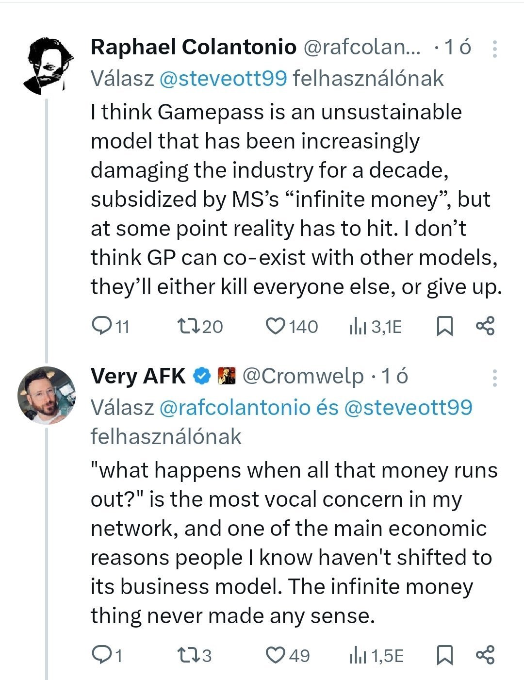 緊接着,《博德之門3》發行總監Michael Douse也在評論中附和:“‘等那些錢燒完了怎麼辦?’是我圈子裏最擔心的問題,這也是很多人遲遲不採用Game Pass式商業模型的根本經濟原因。‘無限資金’這個說法從一開始就站不住腳。”