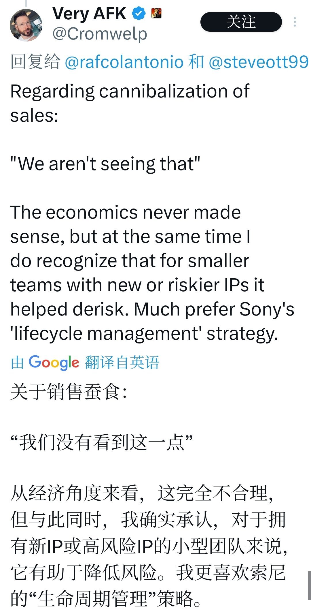 他強調,索尼更傾向於“先在自家平**佔發售,待生命週期後期再加入訂閱服務”的策略,這種“節奏把控”能兼顧首次發行收益和訂閱補充收入,兩者並不衝突。