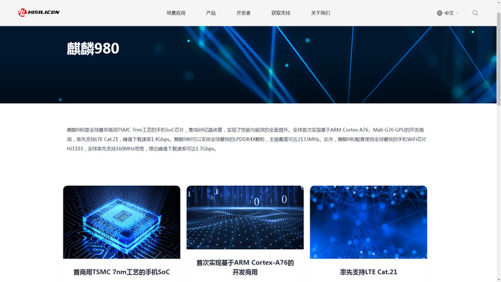 麒麟980配套使用全球最快的手机WiFi芯片Hi1103,全球率先支持160MHz带宽,理论峰值下载速率可达1.7Gbps。(海思官网)