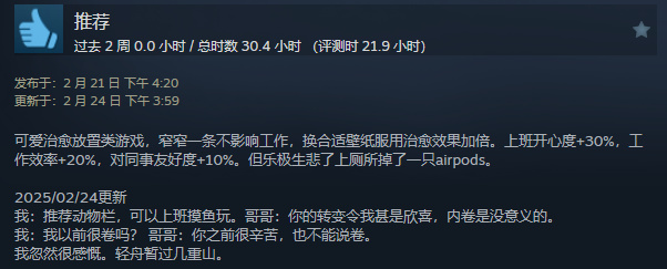 同样以《动物栏》为例,“陪伴您工作与学习”往往是这类游戏宣传时的主要卖点;而在游戏评论区或博主推荐视频中,“在工作学习中摸鱼”之类的话术与感慨也常常被提及。