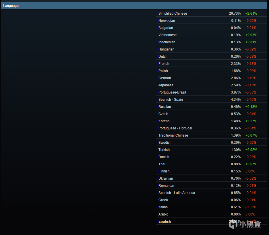 简体中文飙升至 26.73%(+2.61%)增速第一,占比逼近英语