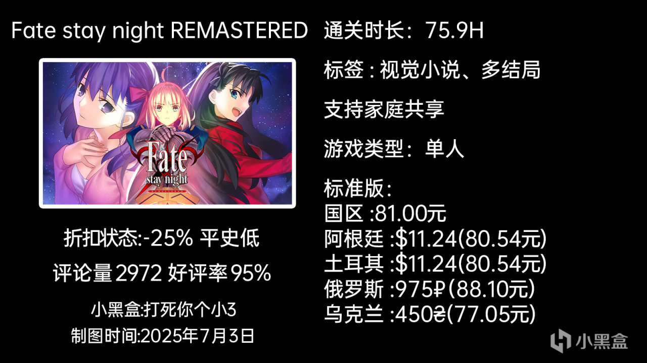6. Fate stay night REMASTERED:视觉小说原点,圣杯战争启蒙,三线补完经典。