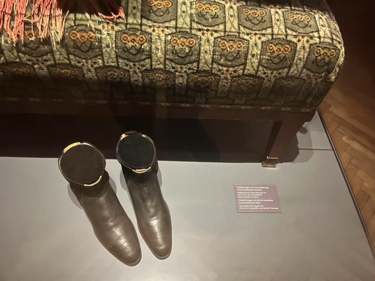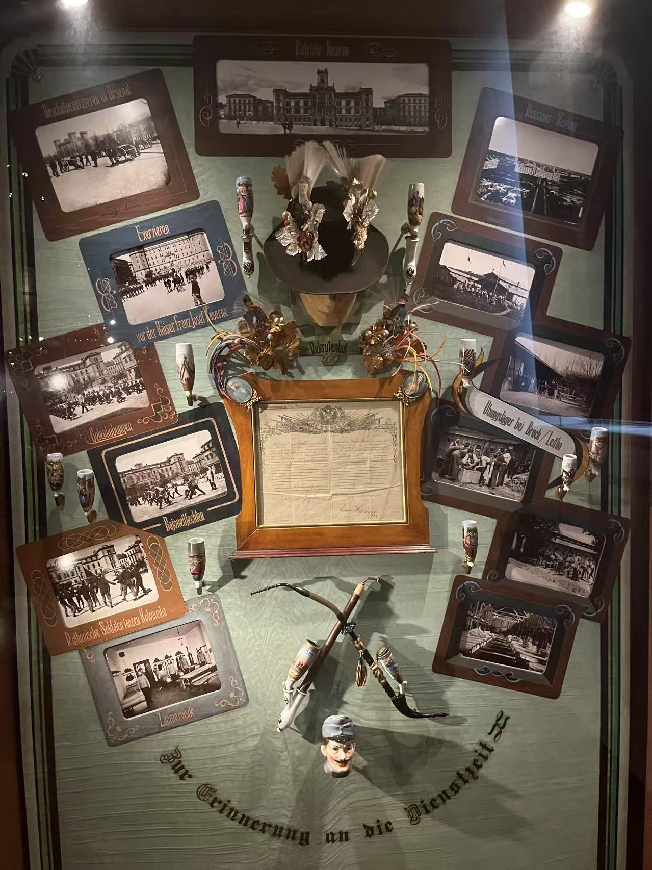 随后我在一面墙上又见到了有趣的展品,中间是装在相框里的文件,相框顶部还有疑似弗朗茨一世和茜茜公主的照片。相框上是一顶黑色的牛仔帽,帽上插着刷子一样的配饰与花朵。