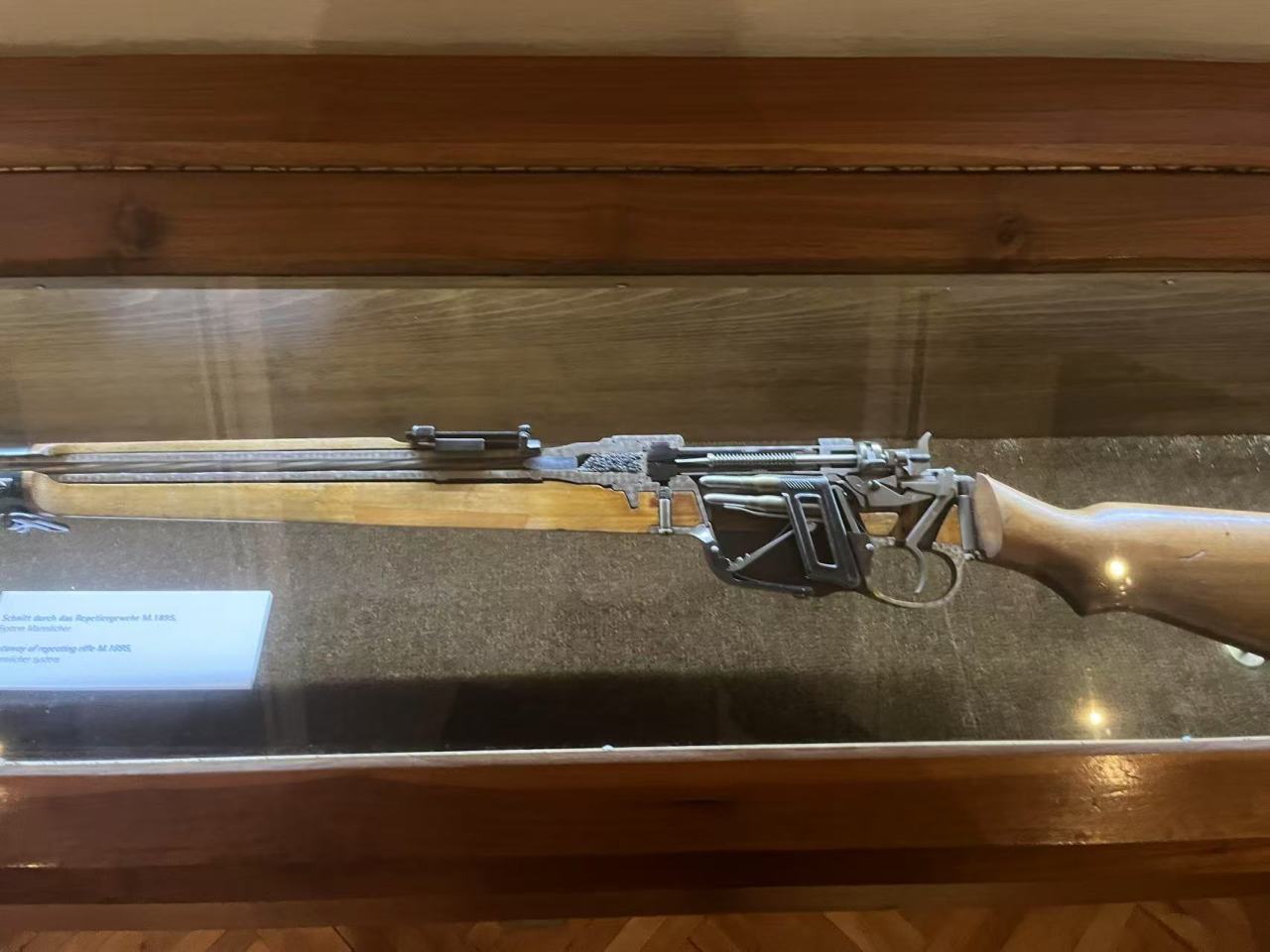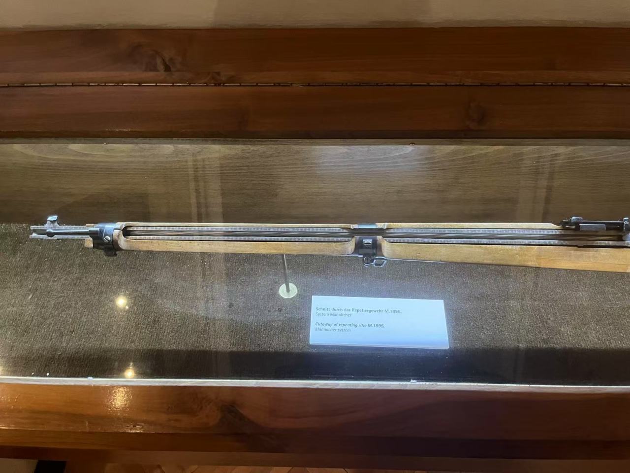再往后面看,我见到了M1895式曼利夏步枪的横剖面模型。这种步枪很有名,因为1895年小站练兵时新建陆军所配备的就是这一型号的步枪,它在当时算是全世界最先进的轻武器了。