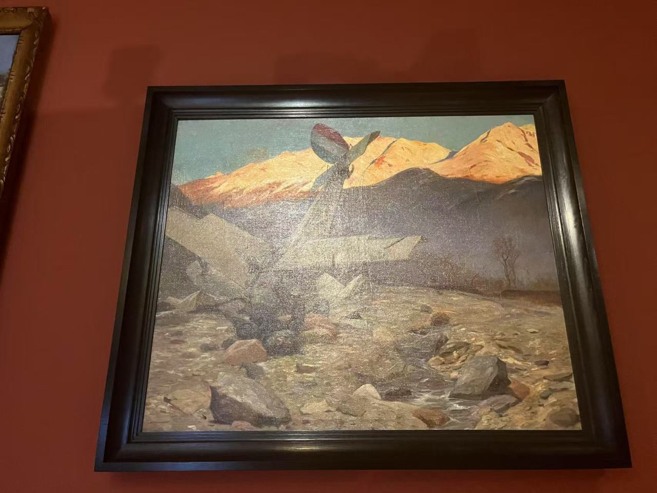 紧接着,一幅油画映入眼帘,画上的骑兵身着蓝色制服,披着披风,右手握刀,骑在健壮的骏马上。他们的头盔样式与刚刚柜子里展示的相同,应该是龙骑兵。