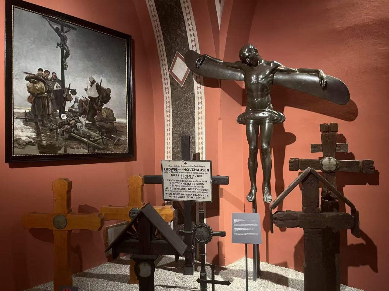 或许就是墓地。但见一尊奇怪的雕塑,一个低垂着头的男人被绑在飞机螺旋桨形状的十字架上,旁边的画里也是打着绷带的伤兵和十字架,看起来是一战中奥匈帝国伤亡士兵的象征。