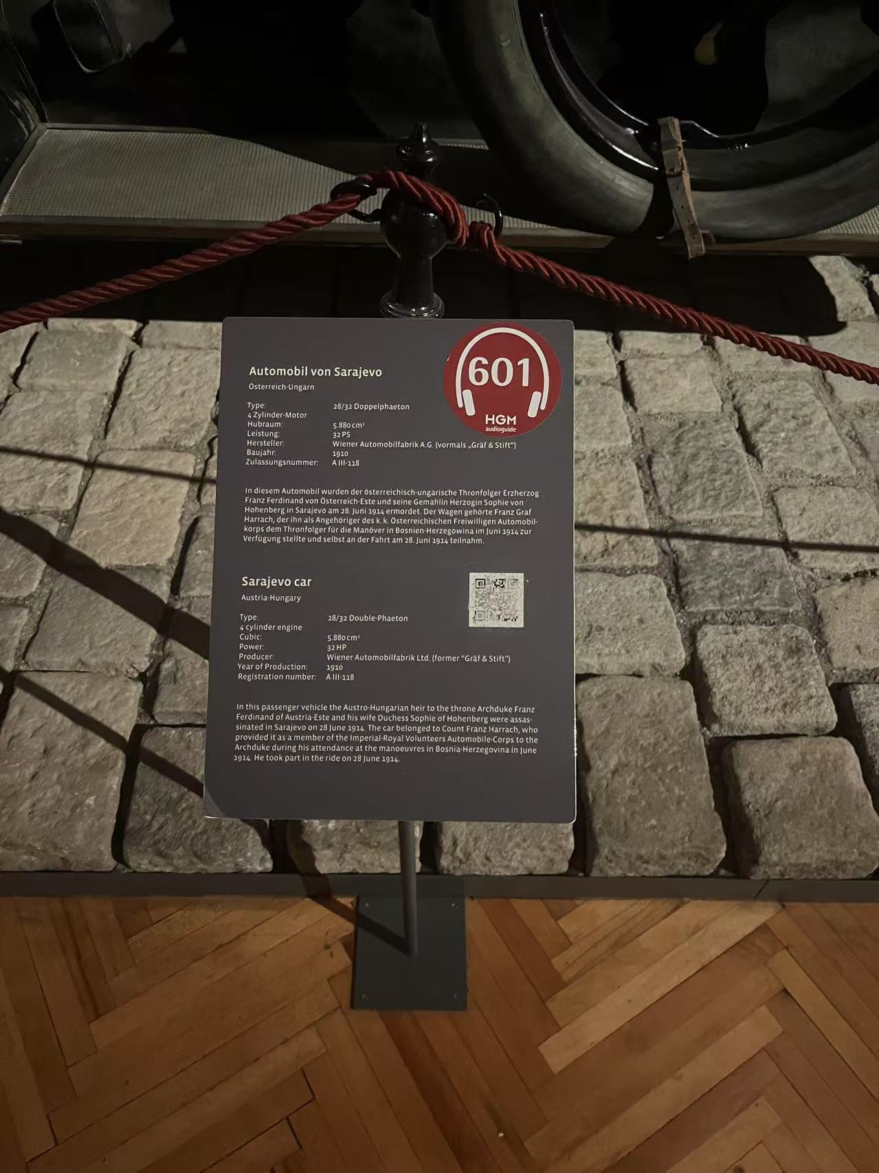 在说明牌上写着老爷车的名字——“萨拉热窝之车”。它是维也纳的生产商制造的,于1910年生产,原主人是另一位奥匈帝国贵族。在斐迪南大公访问波斯尼亚期间,这位男爵把这辆爱车提供给大公乘坐,并使之青史留名。