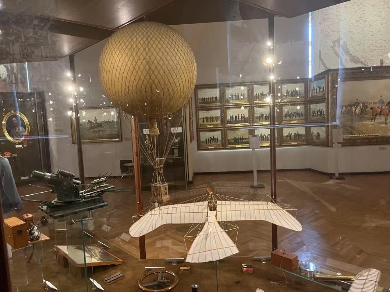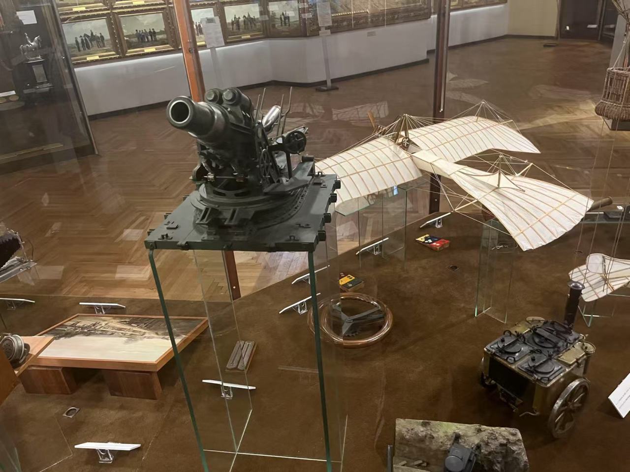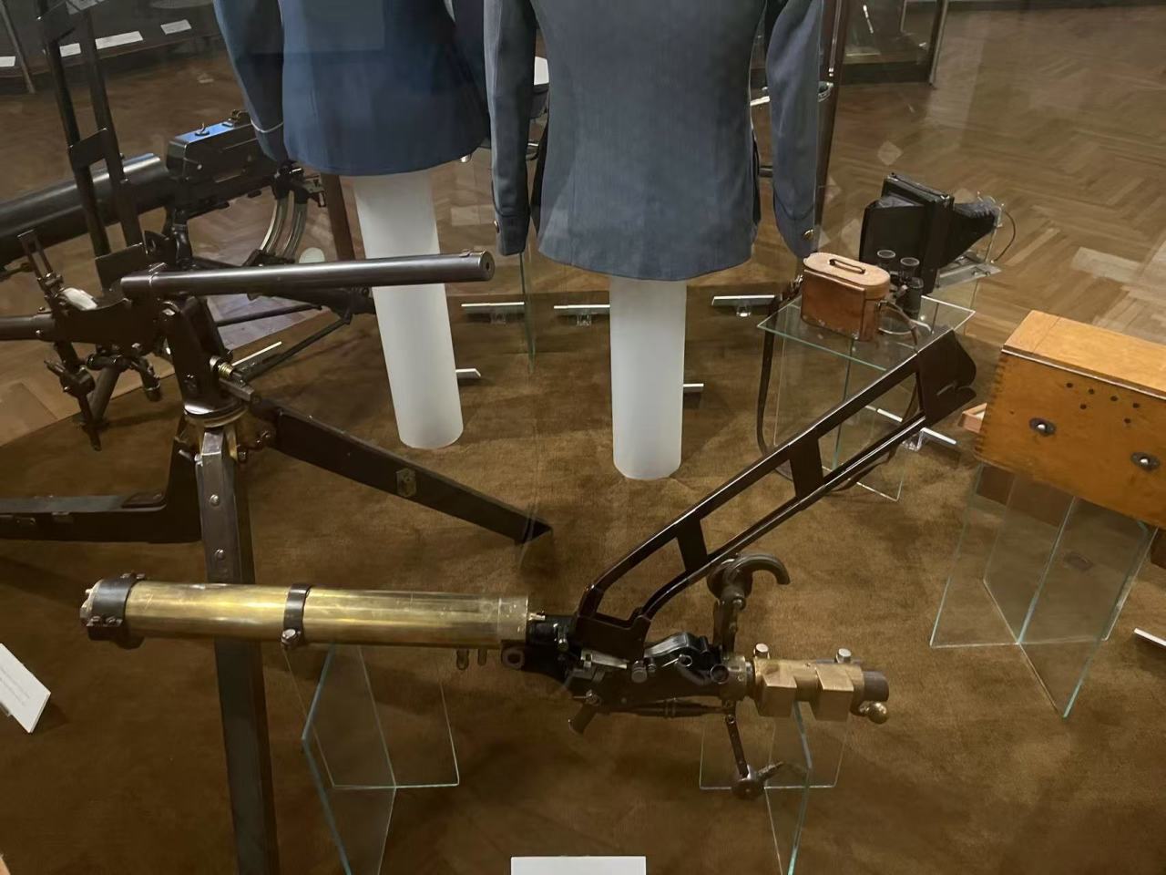 走到另一个宽敞的展厅,仿佛一瞬间进入了战地1的世界里,我也不禁一怔。只见眼前陈列的,有飞机和热气球模型,有望远镜和有线电话等侦察、通讯设备,有机枪与臼炮,甚至还有坦克模型。