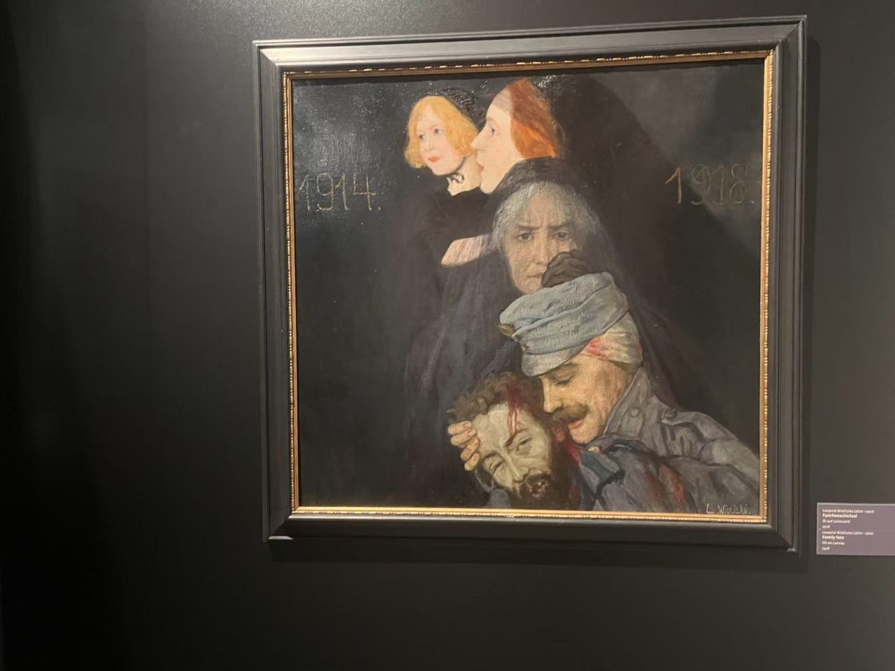 此后是一组油画,也都以是反映战争残酷为主题。比如这张黑色背景的画中,写着“1914-1918”,由远及近依次是寡妇打扮的年轻妇人和老年女性(士兵的妻子与母亲)、头戴绷带的老兵和怀里的年轻士兵。