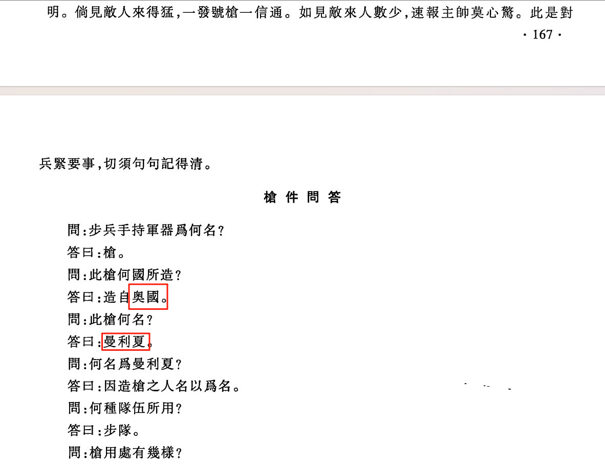 之后又是两行整齐的曼利夏步枪,有M1890和M1895等不同型号。至于为什么叫曼利夏步枪,上面的图里也说了,是“因造枪之人名以为名”。