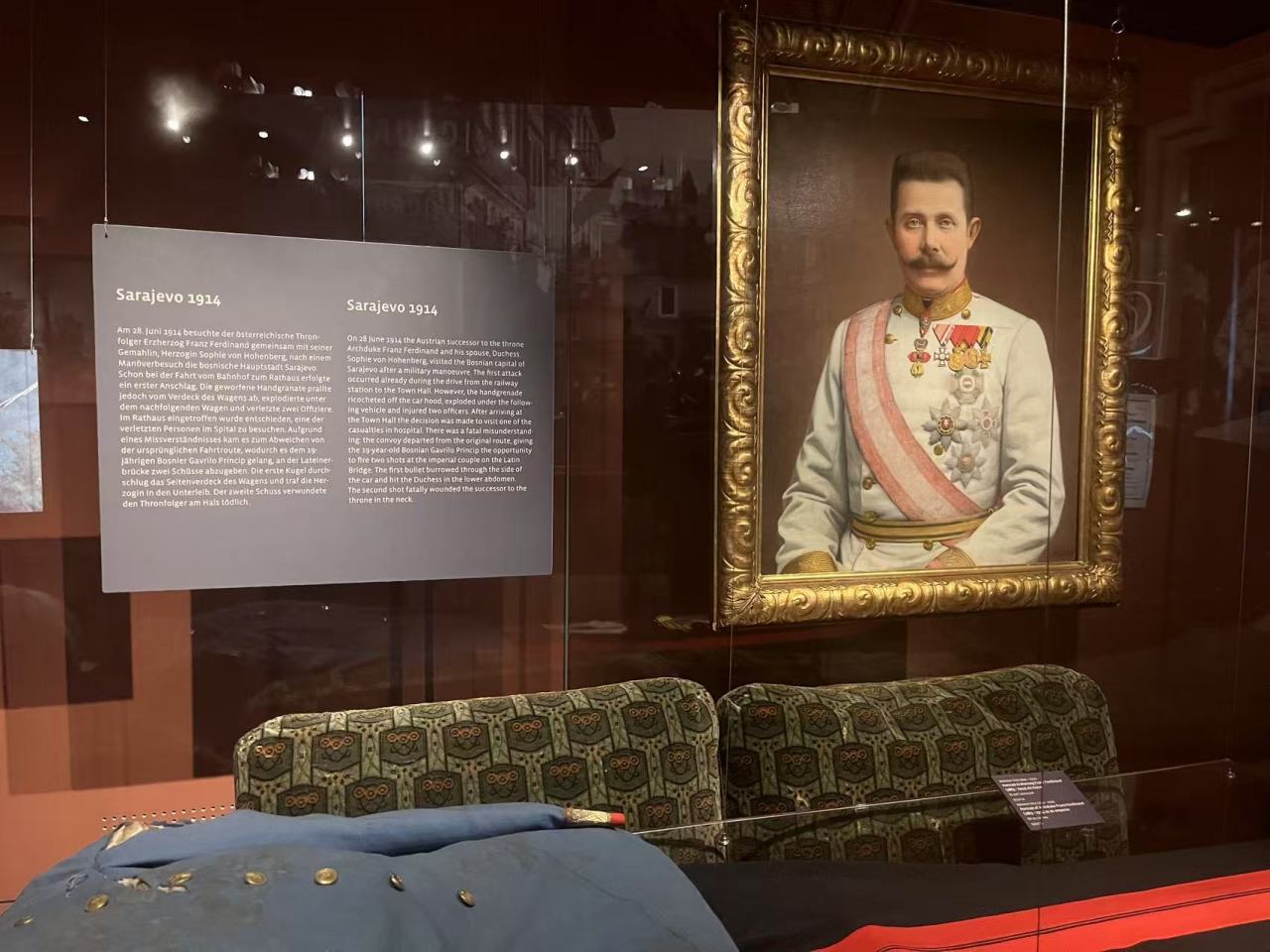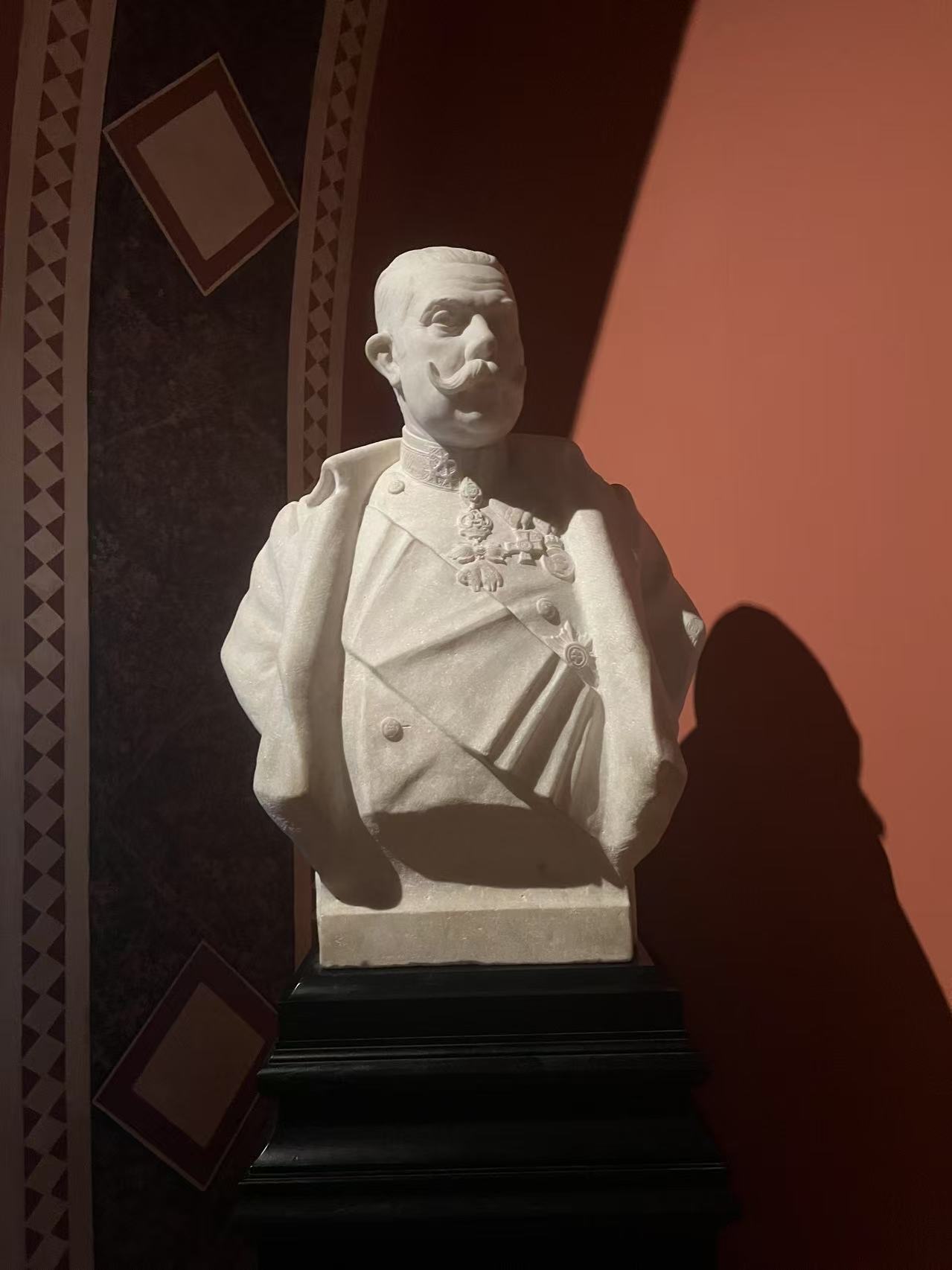 先是看到一个中年人的白色雕像,他留着翘起的胡须,佩戴着勋章,自然是斐迪南大公了。