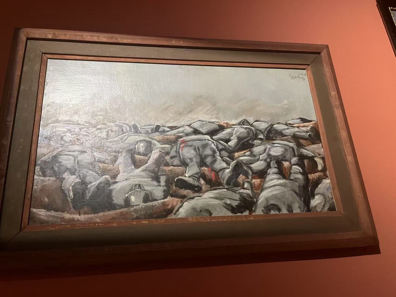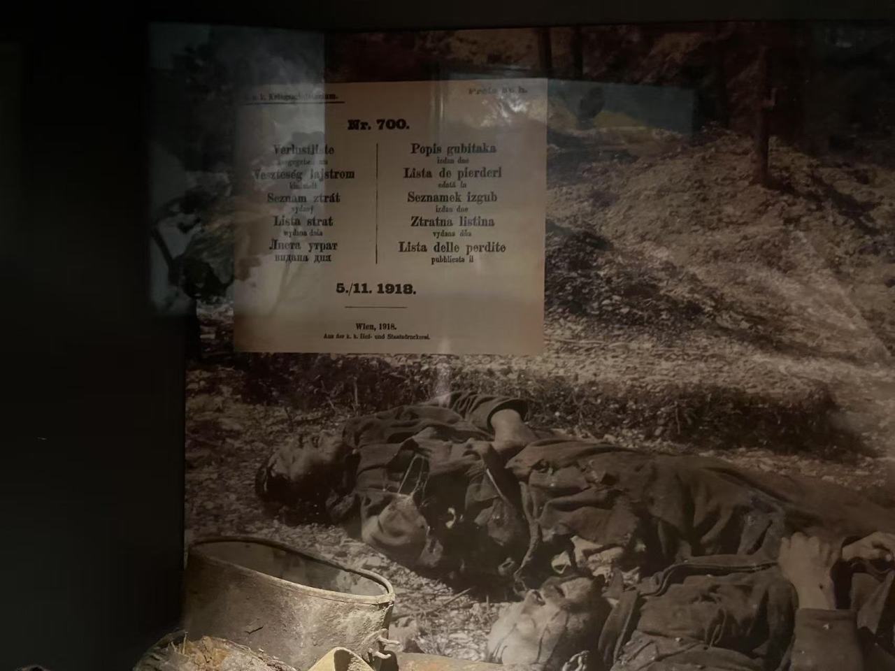 在这些展品的背后还有一张真实的战地图片,几位士兵倒在战地上,大衣上全是弹孔。旁边的文字表明,这是1918年的11月5日。也就是说,他们倒在“终结一切战争的大战”的最后一年,倒在停战日(1918年11月11日)前夕。