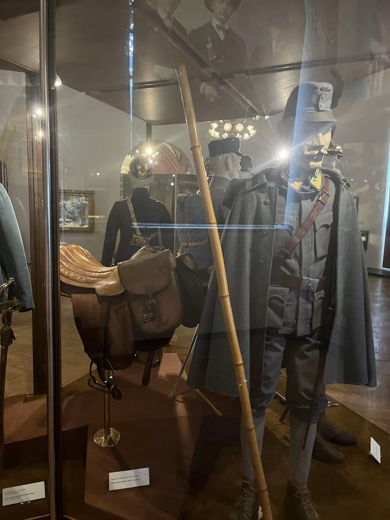 之后的玻璃柜里又是一套完整的士兵制服与装备,包括衬衫、披风、绑腿、鞋子、帽子、武装带、腰带等,还有马鞍和包。那根木棍应该是用来绑旗的,总之不是骑枪。