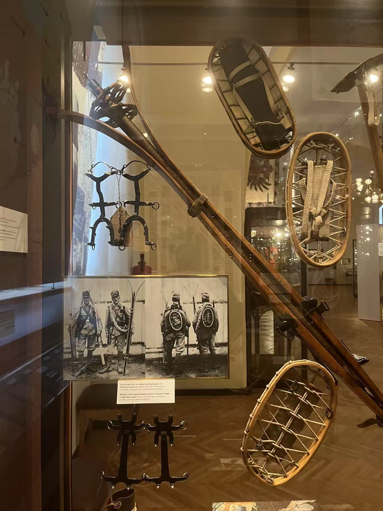 我忽然又看到了一副与周围展品格格不入的“网球拍”,心想这也不是体育博物馆啊。其实,这几副“网球拍”都是奥匈帝国山地兵绑在鞋子上,方便爬雪山时用的。