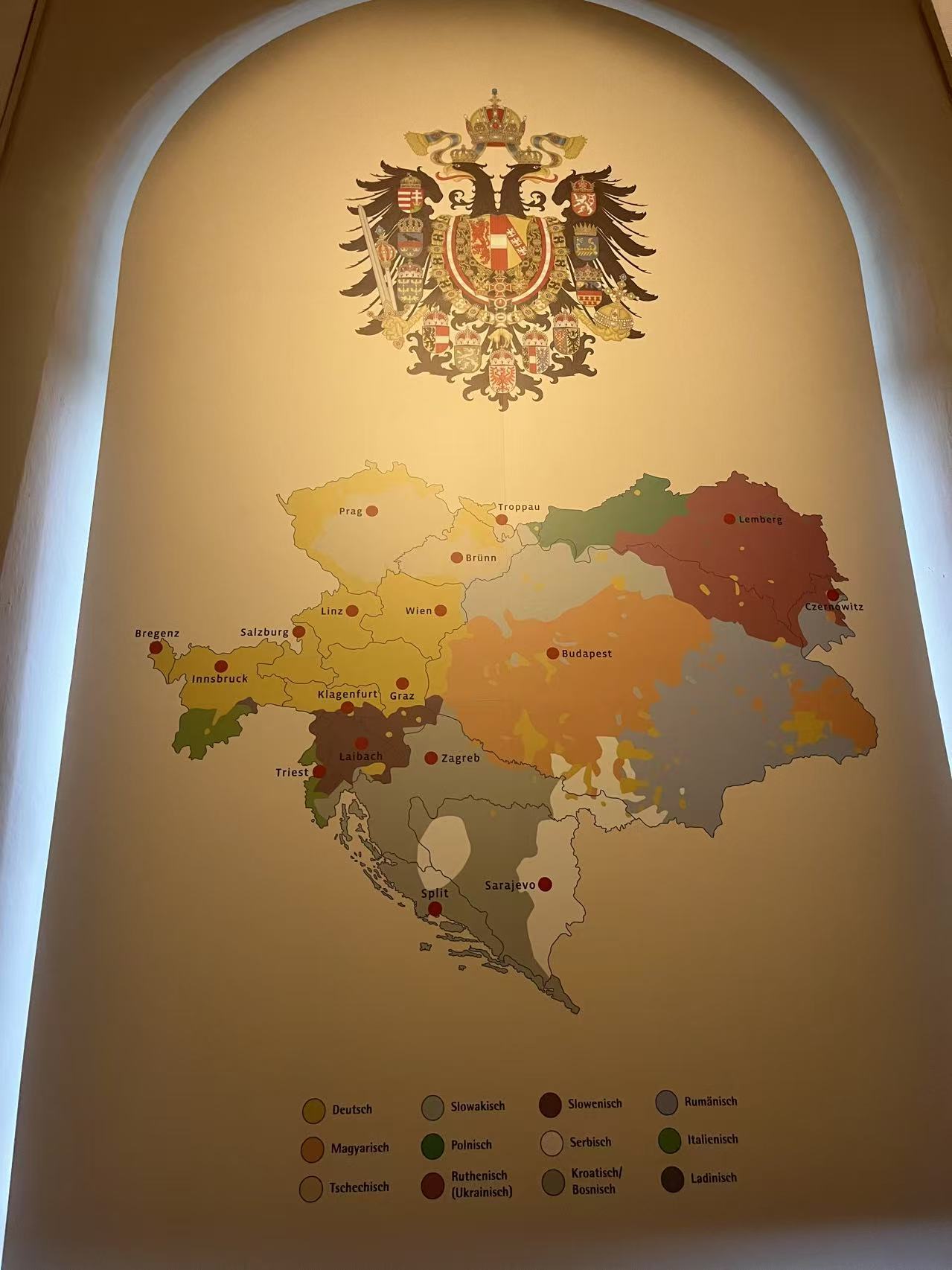 不久我又看到了奥匈帝国地图(已经是第几幅了?),不过倒是不至于审美疲劳,因为它的内容与之前的都不一样,是帝国的语言分布图。淡黄色的是德语,橘黄色的是马扎尔语(匈牙利语)。