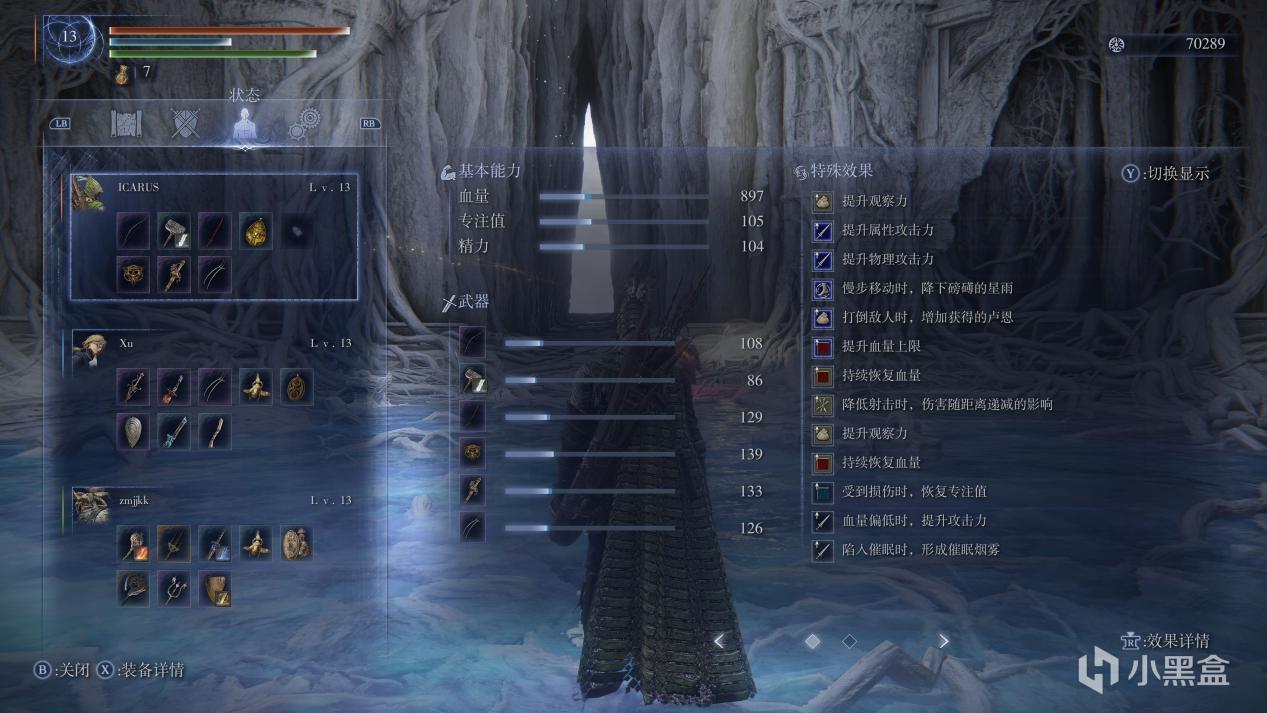 要知道,在本作中不管是遗物成长还是局内刷出来的Buff与武器词条,其大多数都是诸如“物理攻击力提升6%”、“血量瓶恢复量提升20%”、“耐力提升10%”等等纯粹数值意义上的提升;略微带有特色的词条也不过是“缓步移动时召唤星云”、“受到伤害后变成虚血立刻攻击恢复血量”之类;“无赖在碑石附近获得减伤和耐力提升”“追踪者或者铁眼能够拥有两段小技能储备”这些能够从根本上改变玩家游玩策略的寥寥无几,且基本都集中在各种遗物之上。