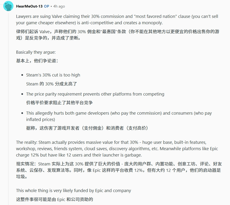 Valve 要求開發者在其他平臺(如 Epic Games Store、GOG 等)上不得以更低價格銷售同款遊戲,涉嫌抑制平臺間價格競爭,最終導致玩家“花更多錢”、開發者“拿更少分成” 。