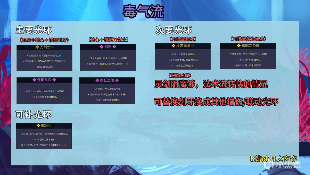 核心是刀剑士+剑牙达成灵剑毒气双循环,灵剑附魔够(常驻11到12把),法术流转快的情况可以把剑牙替换成其他增伤或联动光环。