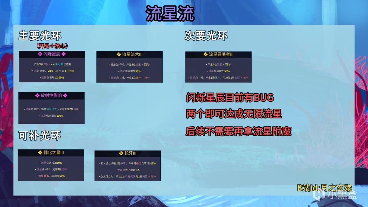流星加强后,也是半步T0的流派,核心是闪烁星辰这个光环,2个既可达成无限流星,后续不需要再拿流星附魔。(双电流星无限是个BUG,后续版本有可能会修复)