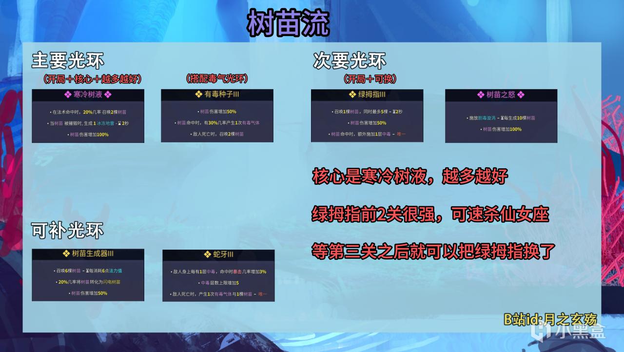 核心光环是寒冷树液,越多越好!另外注意一下绿拇指这个光环,玩树苗流,前2关看到必拿,有个3级的绿拇指1村或2村可以轻松速杀仙女座拿到奖励。 (3村后可以换成其他更强的光环)