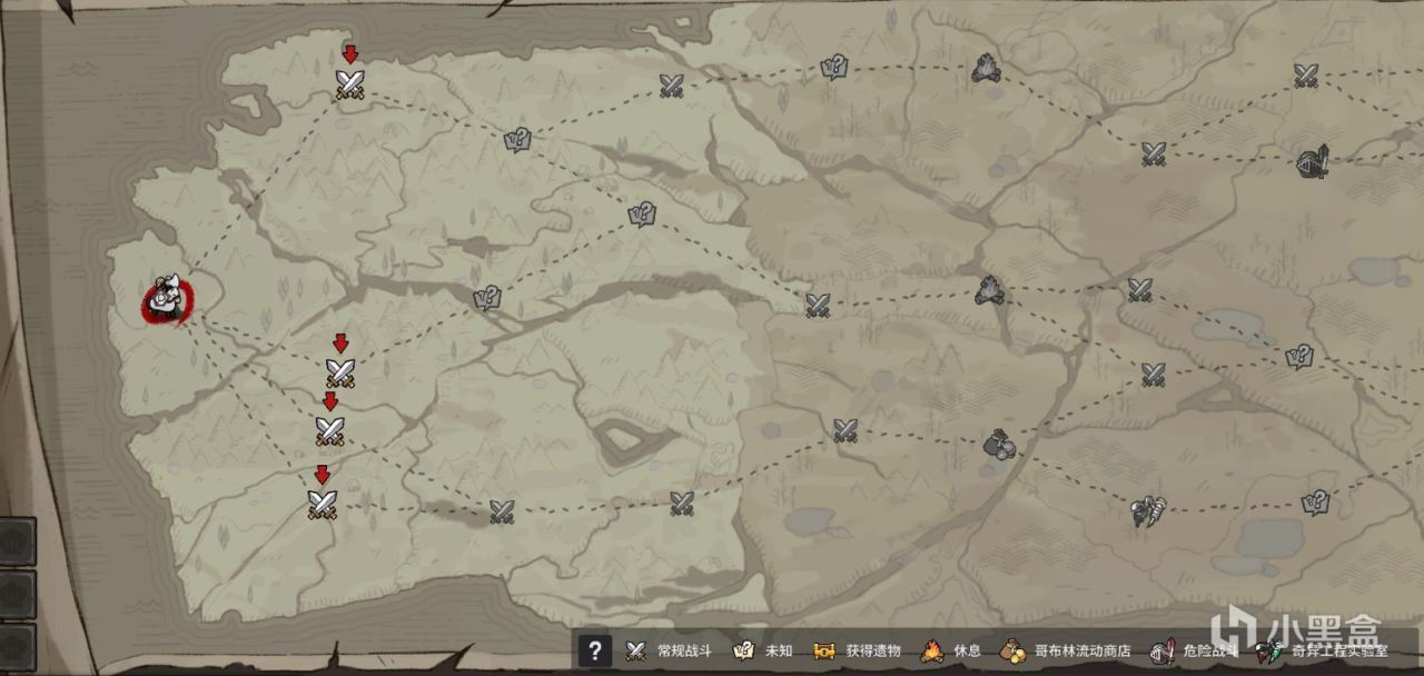 接下来就讲讲游戏的玩法,首先从地图上面可以看到,它其实是一个横向爬塔的设计,下面很多东西想必兄弟们都很眼熟,无论宝箱还是篝火,可以说是卡牌类游戏的常客了。但是奇异工程实验室你见过吗?