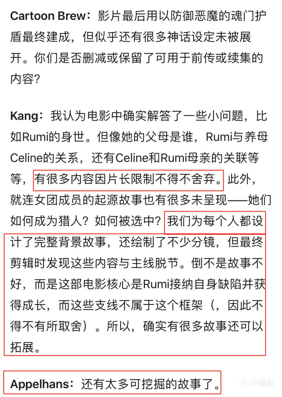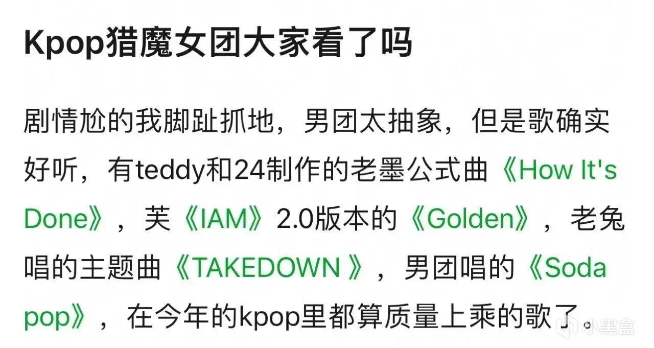 所以,总体上来说《KPOP猎魔女团》虽然在某些部分,比如剧情、人物塑造上不尽如人意,但依旧瑕不掩瑜,靠着音乐、视效、出色的人物设计赚回了不少口碑,也赢得了如今的佳绩。