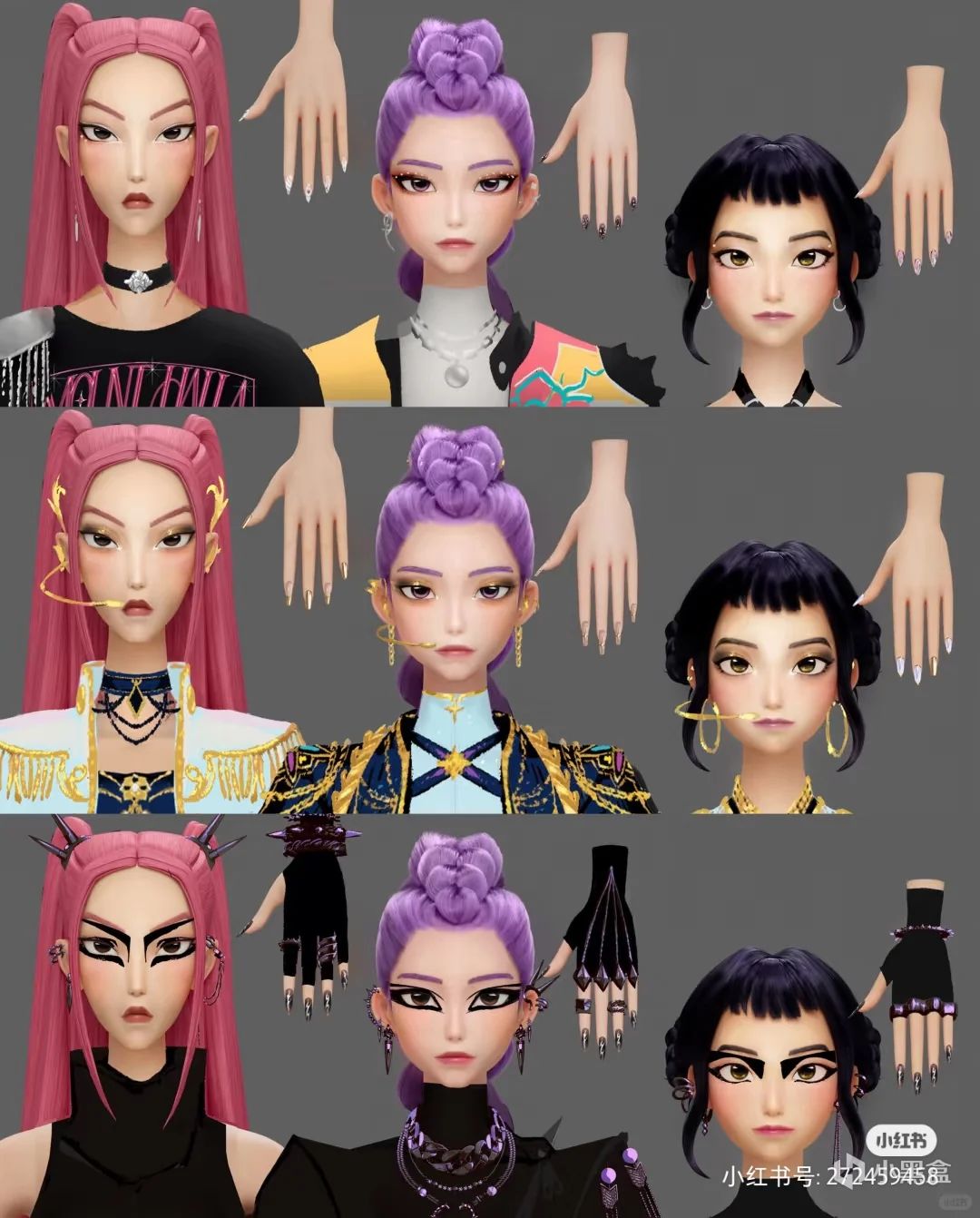 后续,便在角色的形象设计上下足了功夫。主角三人组外貌上几乎融合了BLACKPINK等热门女团成员的特点。而巡演、打歌的妆造设定,也参考了现实中女团可能会有的搭配,甚至连美甲都有详细的设计图。