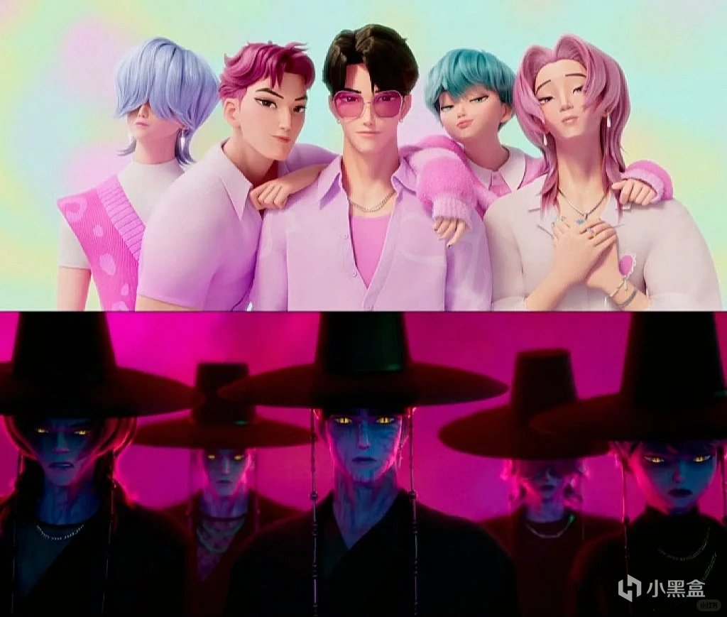 而Huntrix与反派男团Saja Boy之间敌对关系,表意上可能是剧情中所展现出的人类与恶魔之间的竞争。