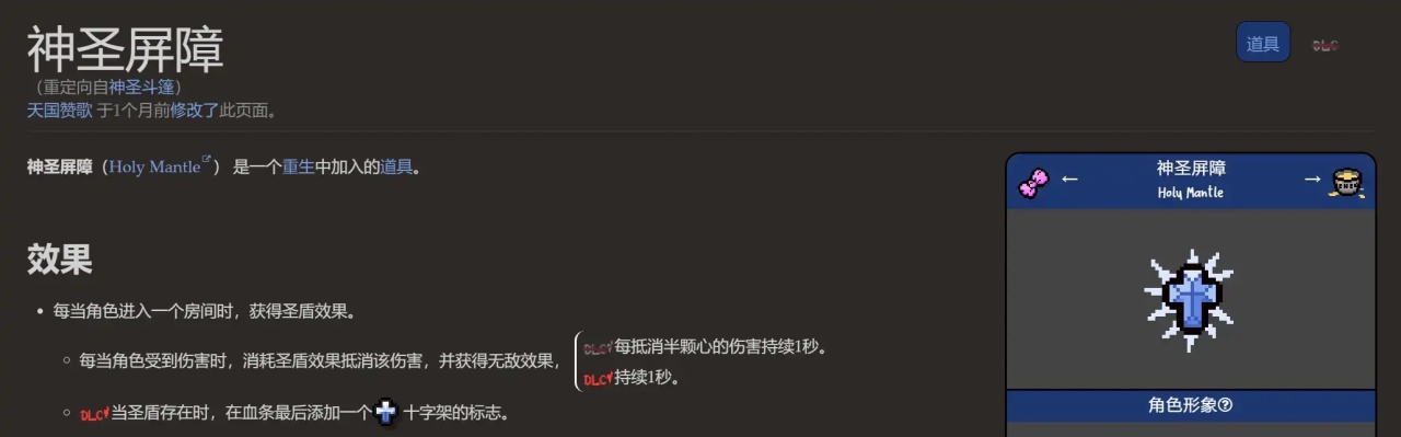 可以看到,左上角的血條被隱藏了,取而代之獲得了道具“神聖斗篷”的效果,意味着玩家只有一次的受傷容錯(在同一個房間盾碎了後再受傷就會死)