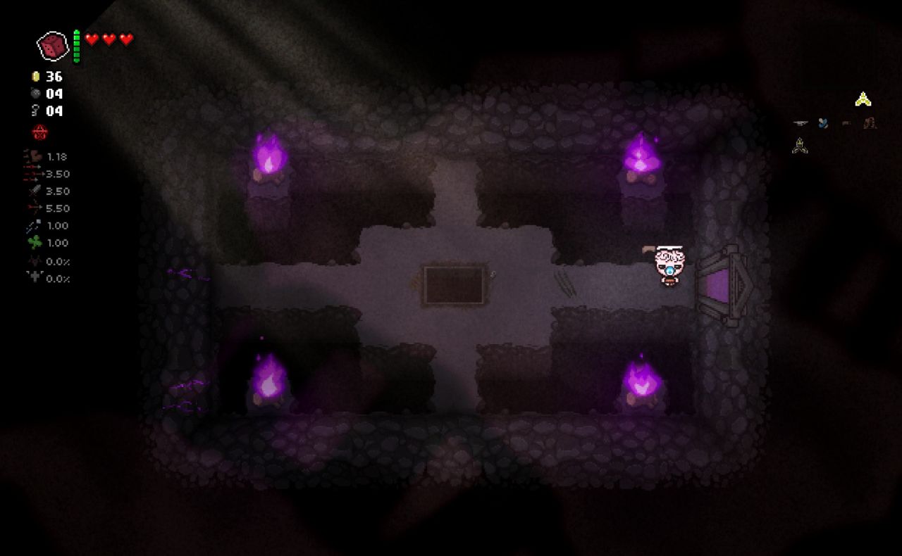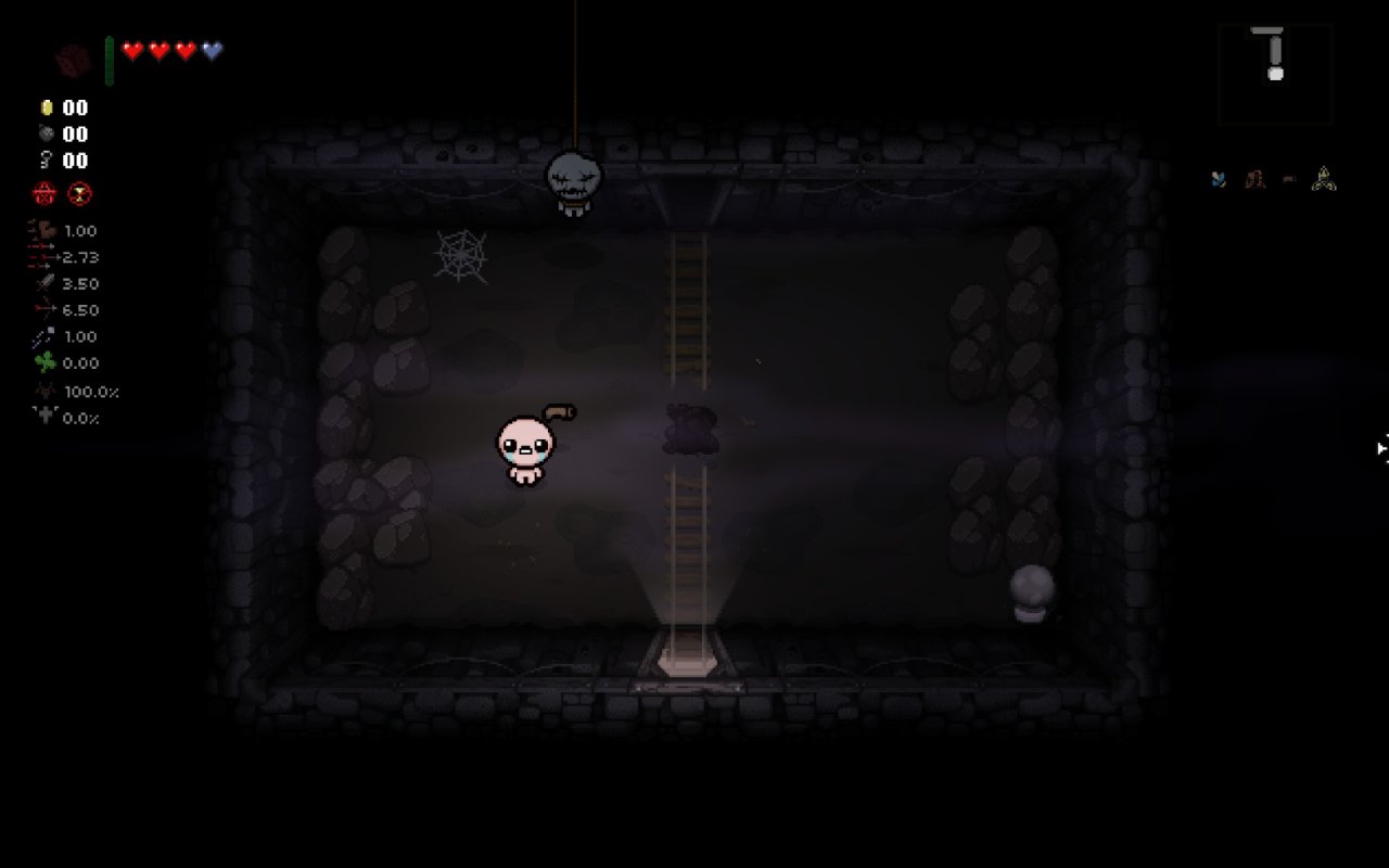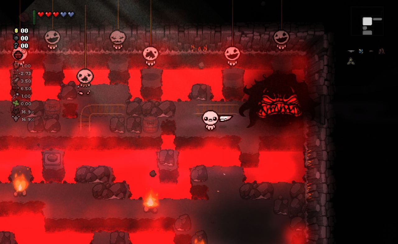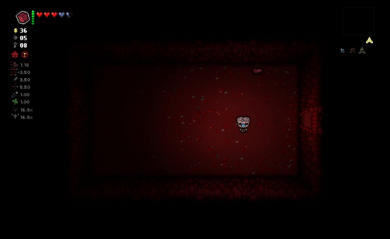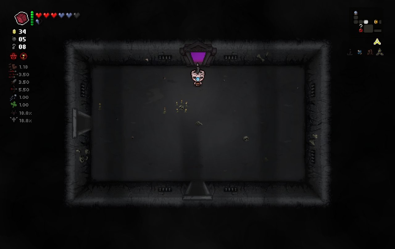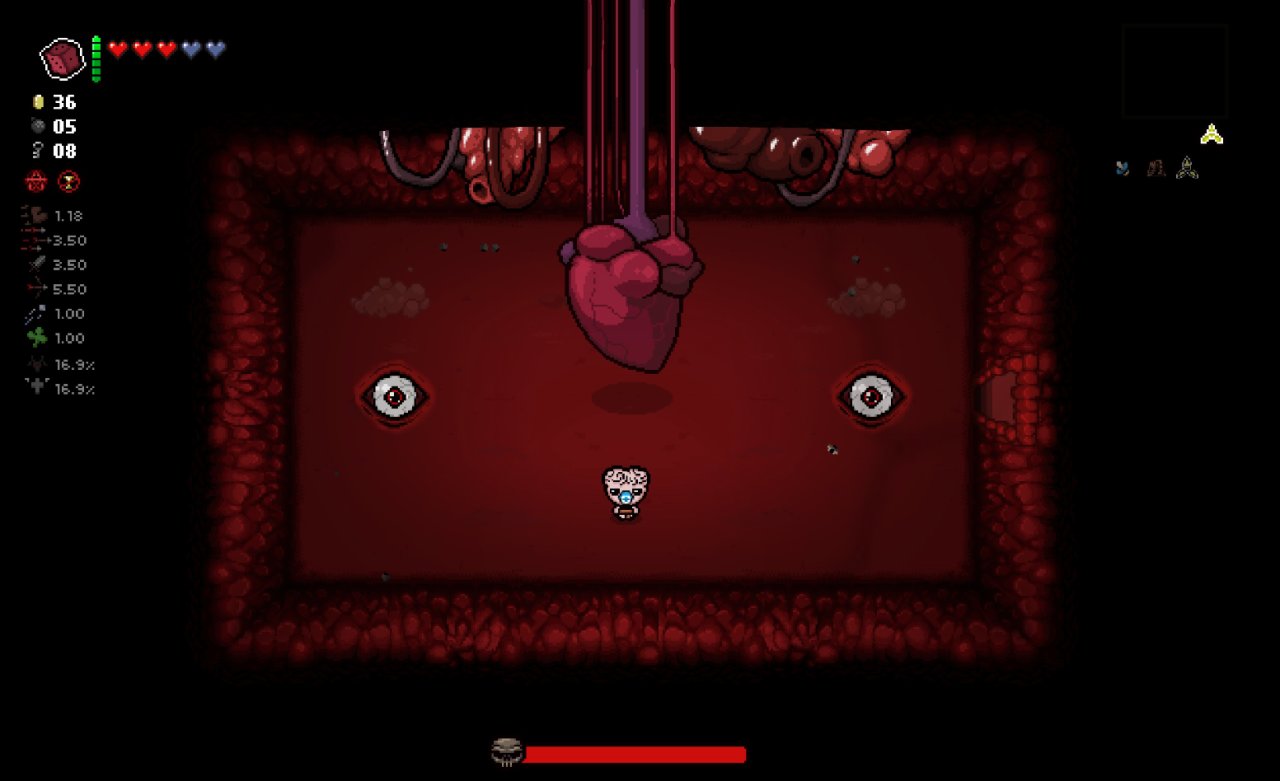趣談:如果玩家在有傳送能力的情況下,在打敗紅色肉門後的強化媽心之後傳送出BOSS房,會發現地圖外一片死寂,所有東西都會消失(包括寶箱房和商店)