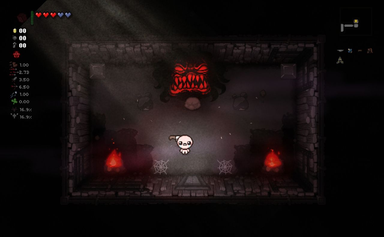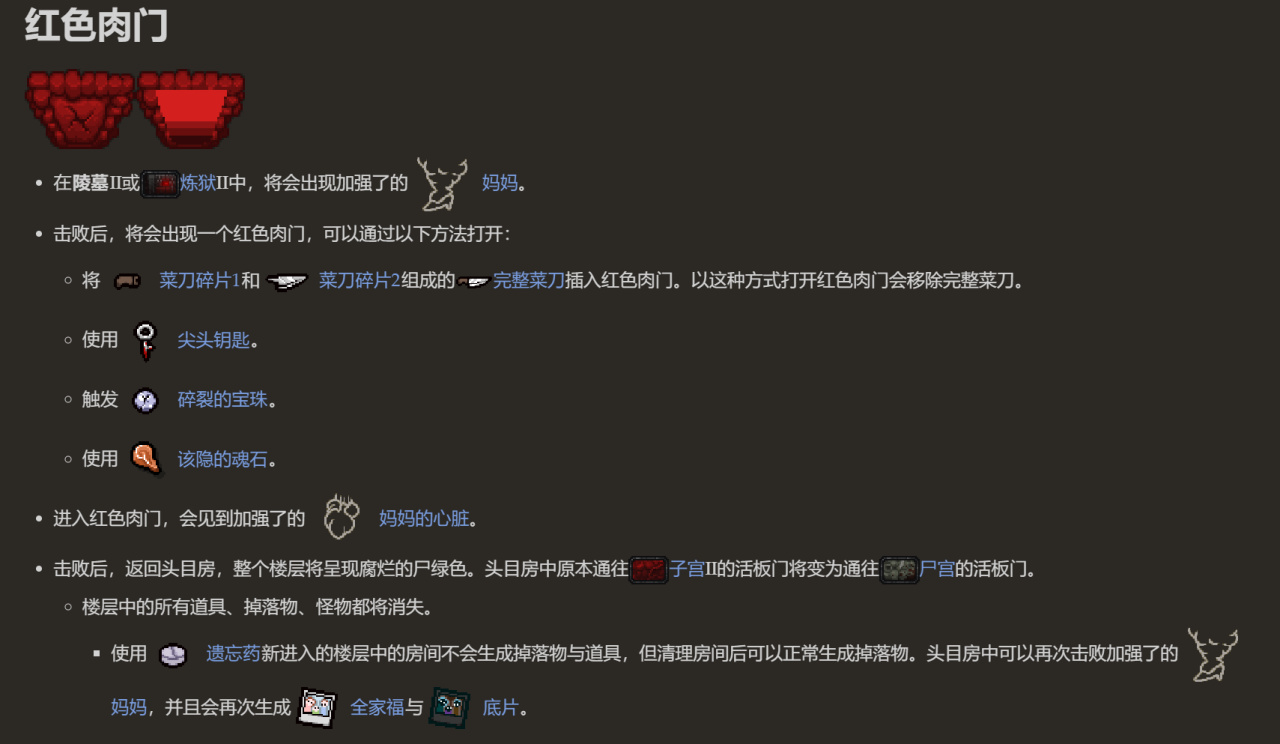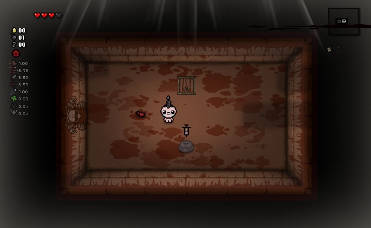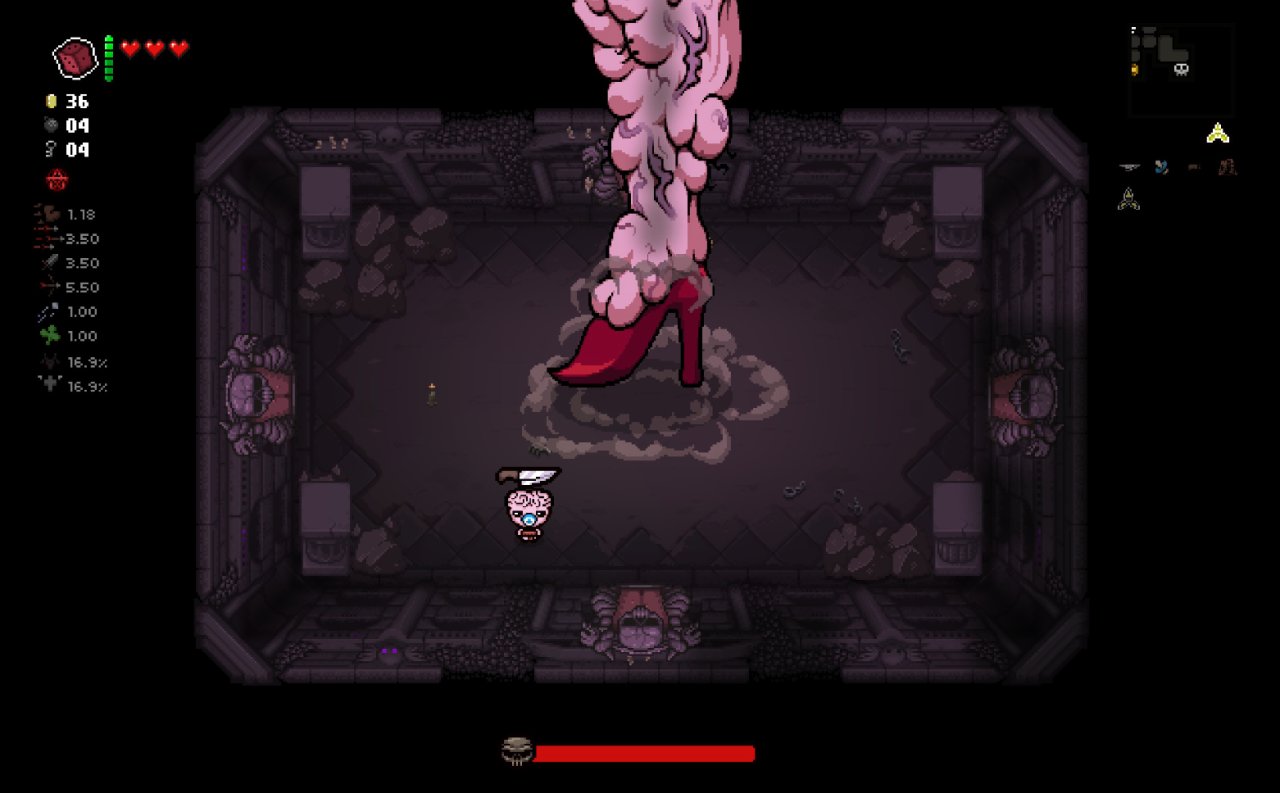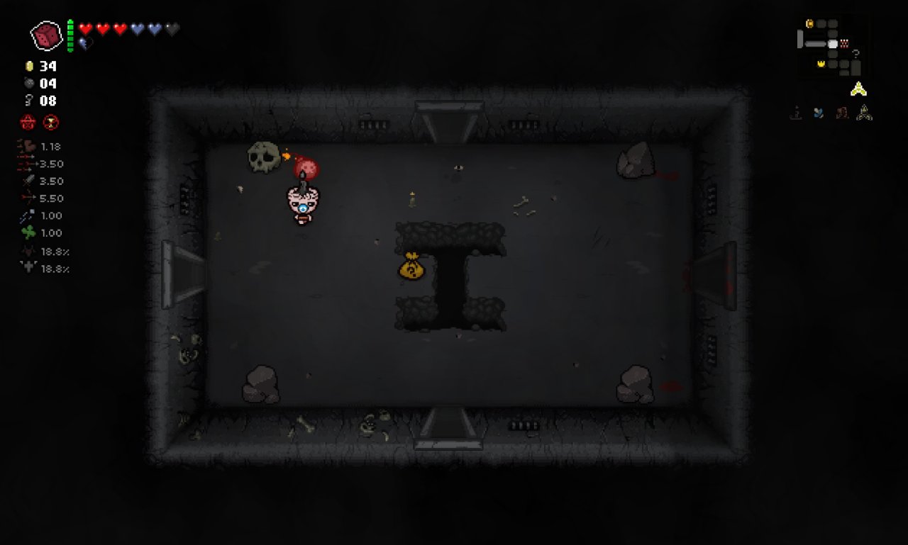 趣談:如果玩家在有傳送能力的情況下,在打敗紅色肉門後的強化媽心之後傳送出BOSS房,會發現地圖外一片死寂,所有東西都會消失(包括寶箱房和商店)