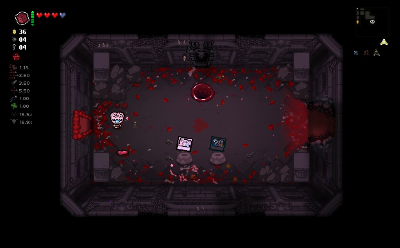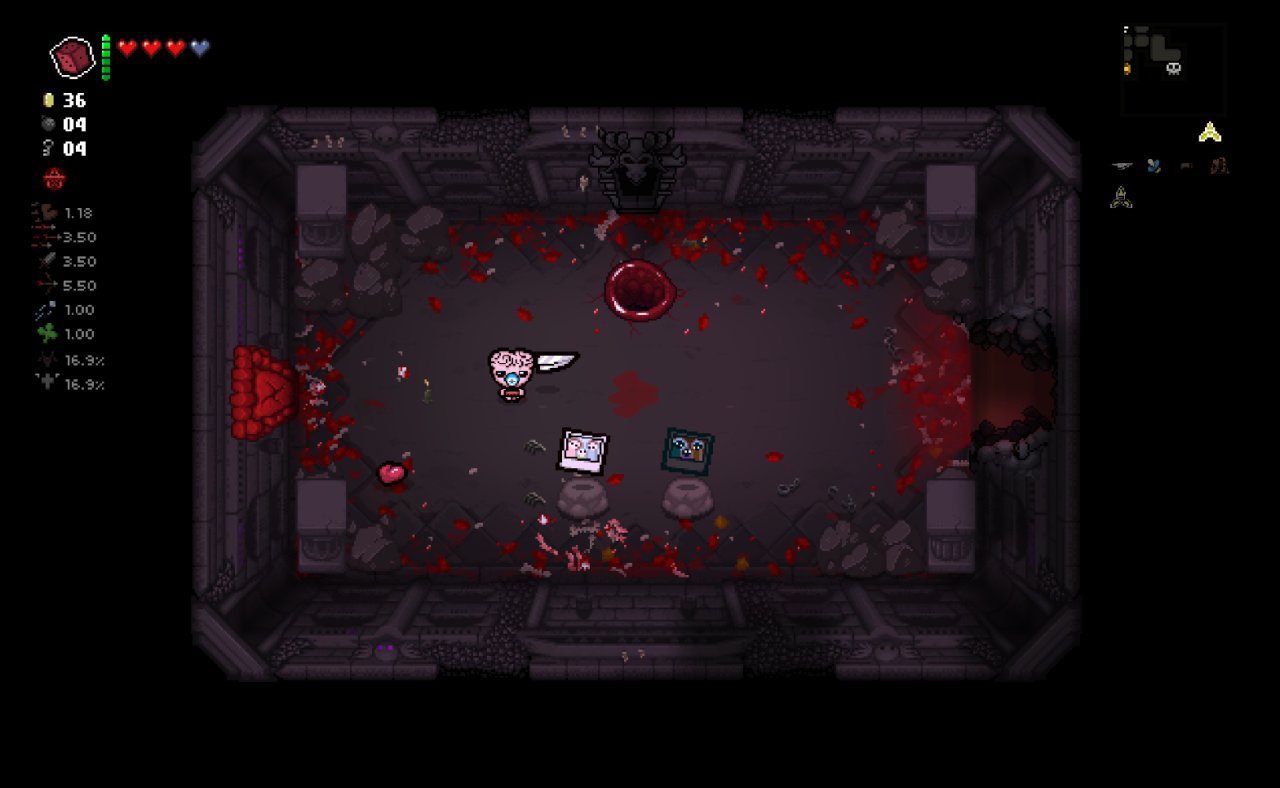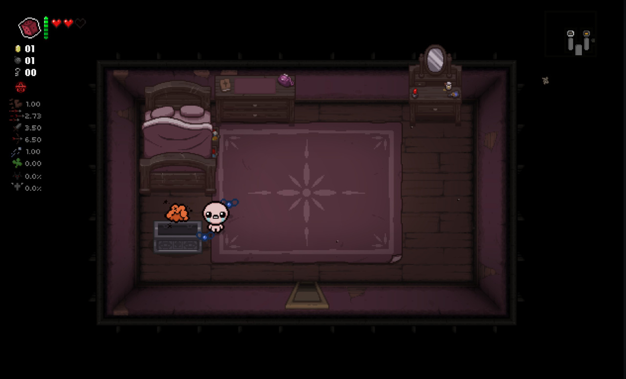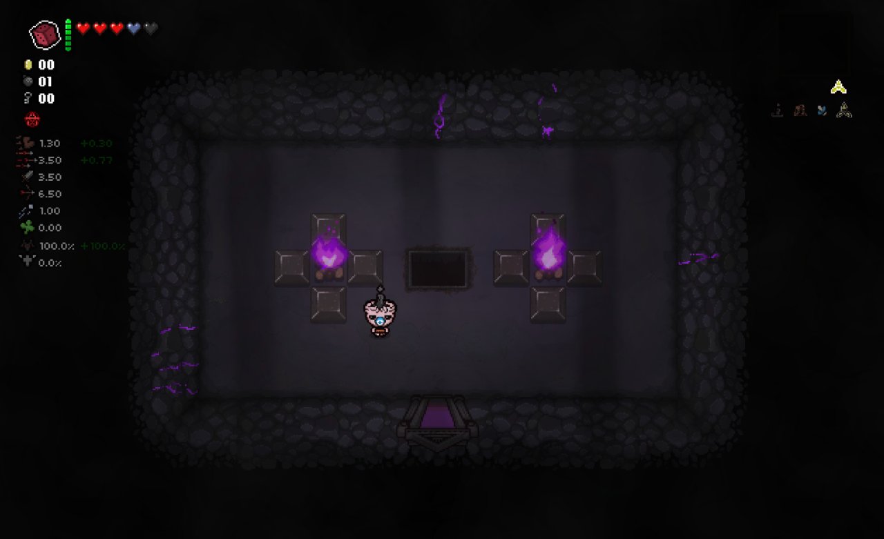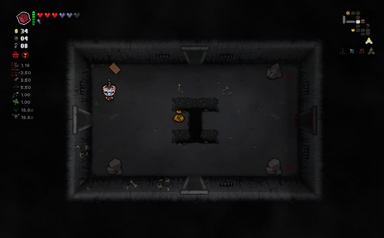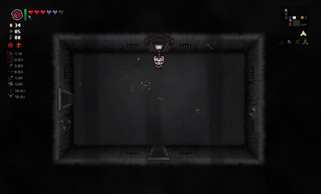 趣談:如果玩家在有傳送能力的情況下,在打敗紅色肉門後的強化媽心之後傳送出BOSS房,會發現地圖外一片死寂,所有東西都會消失(包括寶箱房和商店)