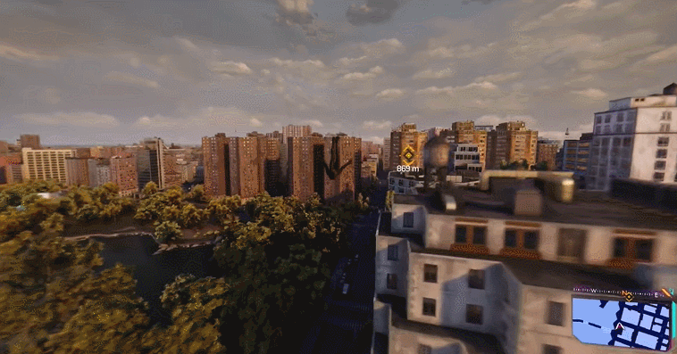 你可以将一个都市打磨得十分精细,但也可以将其当作一个背景,只做有限的、主要的交互内容。比如在索尼失眠组的《漫威蜘蛛侠》里,也有一个规模很大的纽约,但里面的高楼大厦更多只是蜘蛛侠“蛛丝摆荡”玩法的一个背景。而这种较为针对性的功能设计,其实并不会削弱玩家对于都市的代入感。