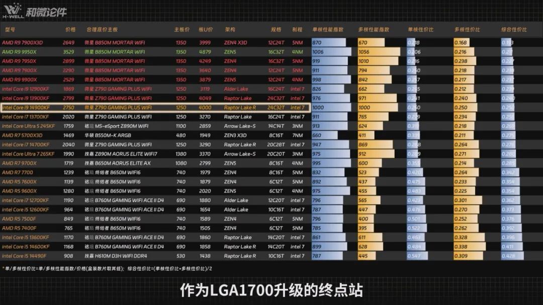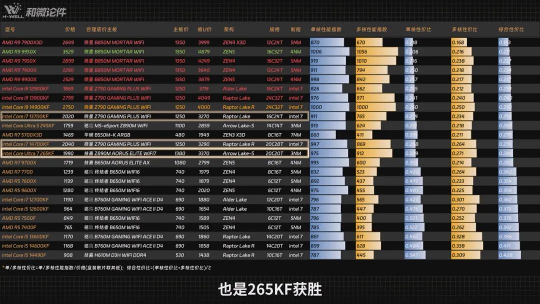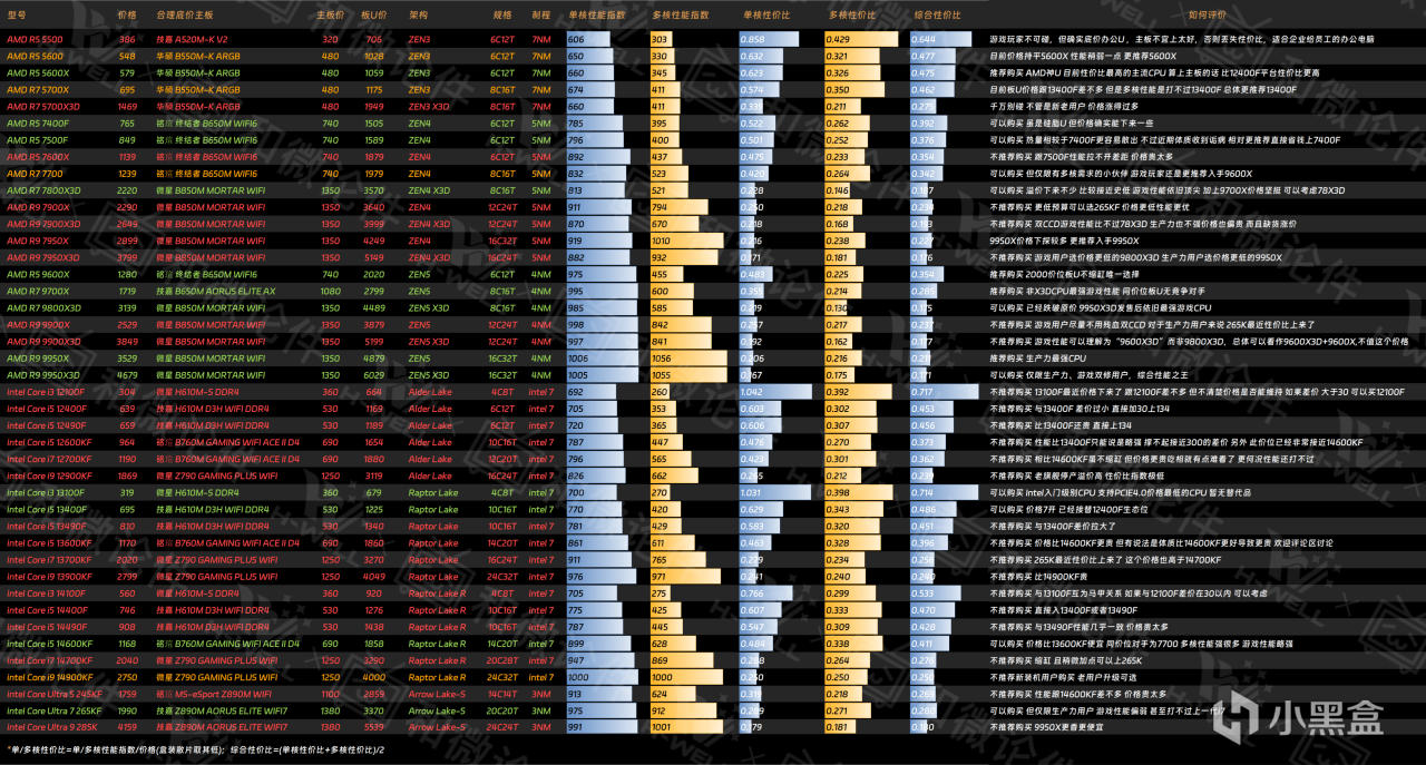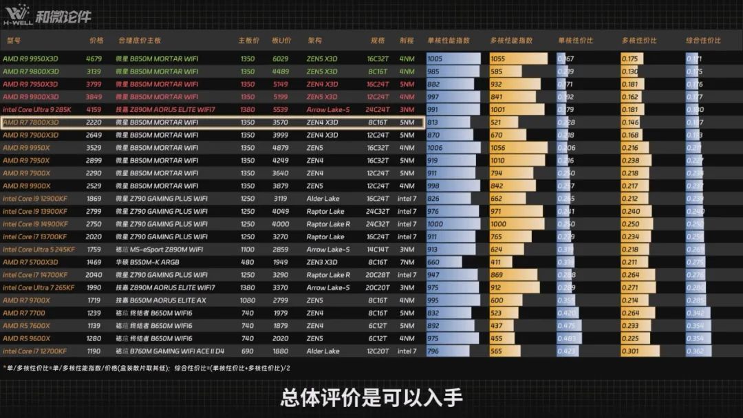 接下来登场的,是9800X3D,他的性价比指数排这么低,也不算出乎意料,因为他本就不是以单核多核性能为生,3D VCACHE的游戏性能无法在本表中体现出来。