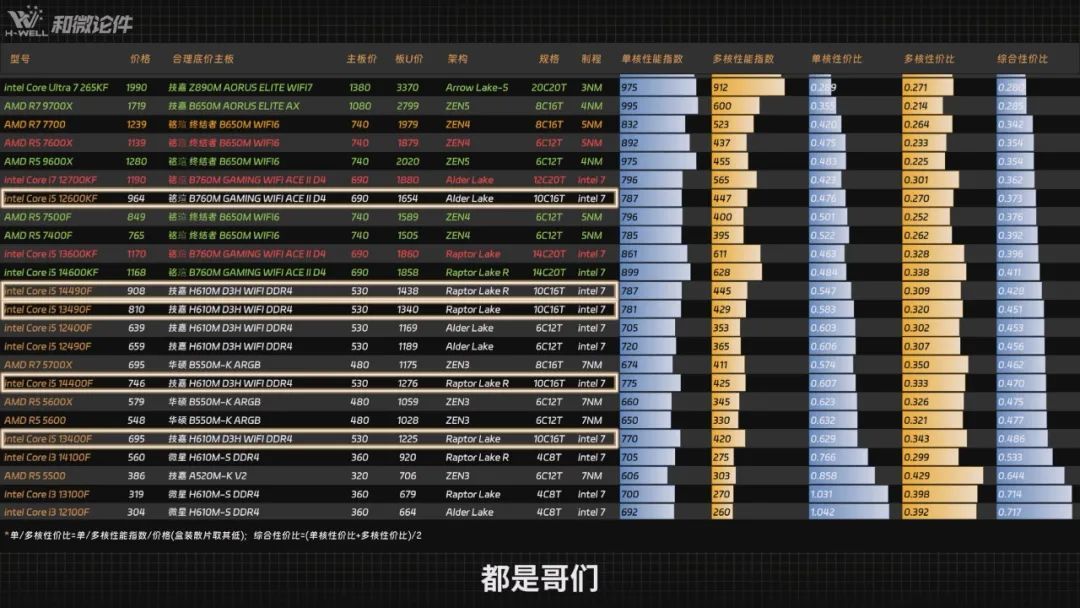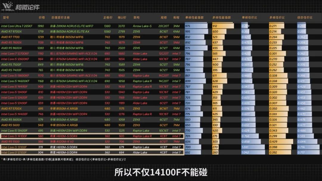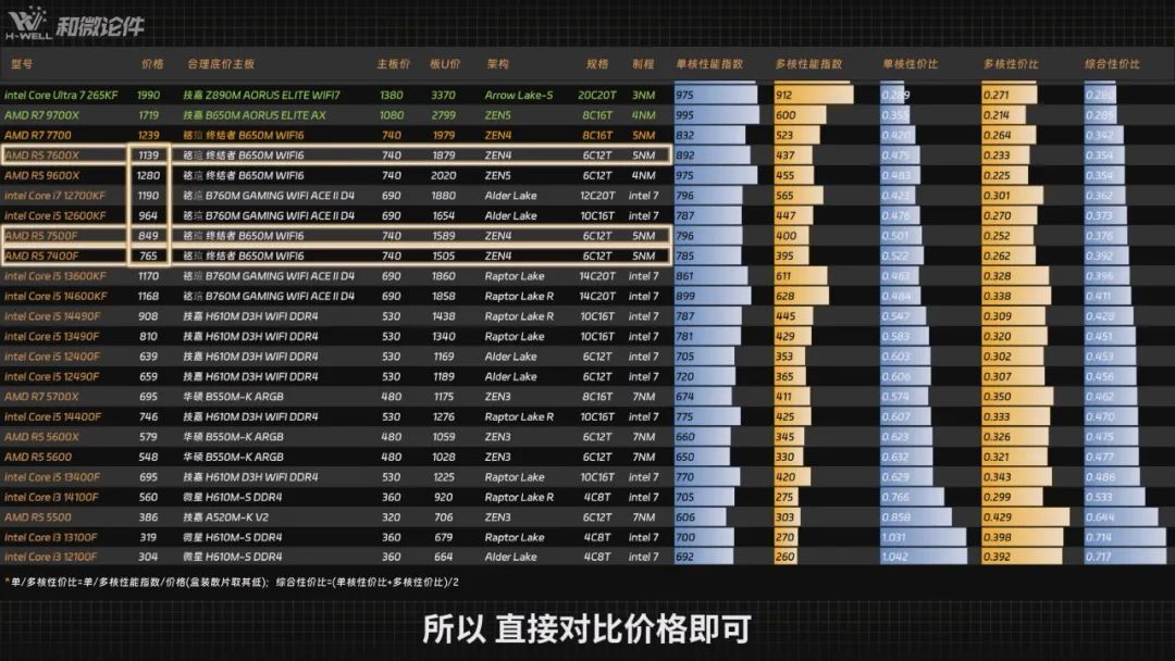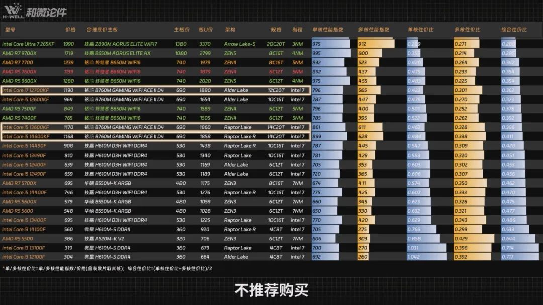 如果你是游戏玩家,最近有组新电脑的需求 , 只要CPU没有出现在这个表格中,那就不推荐购买,就算在这个表格中,也不是全都值得购买,我们利用图表下方的算法,得出了最后一列的综合性价比,然后将综合性价比进行排序,得到了这种综合性价比倒置天梯图,从上到下,再一一进行核验,看看到底哪些U不值得碰。