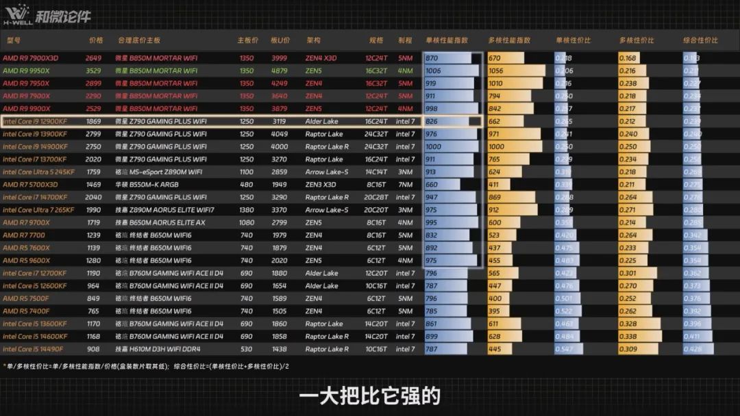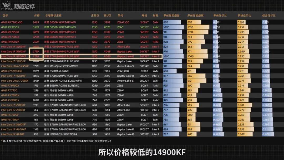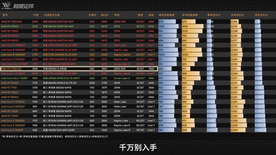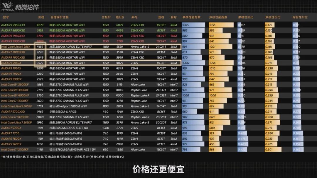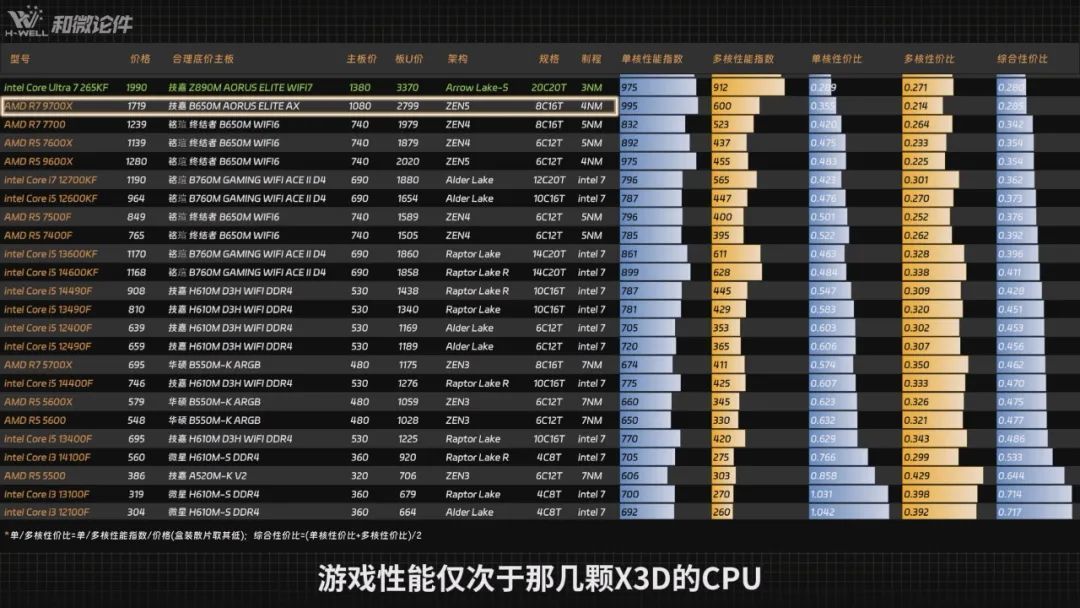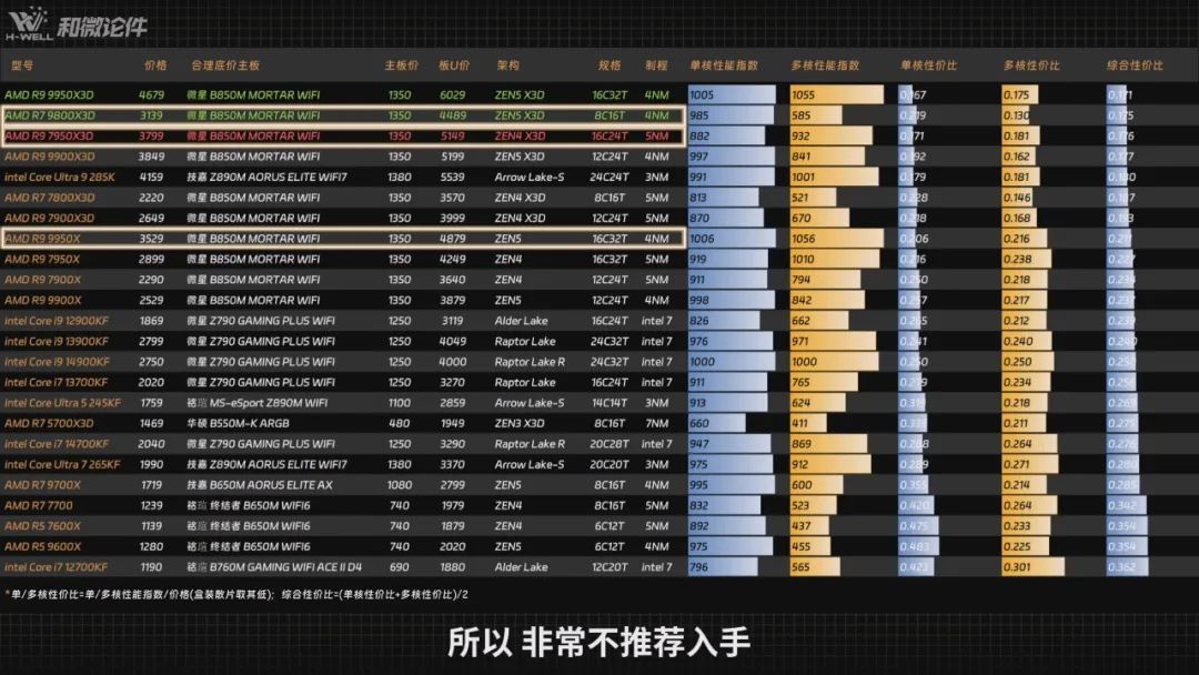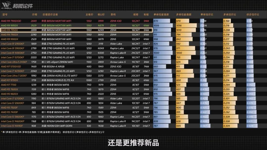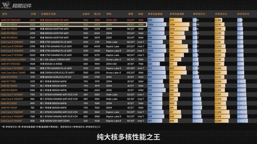 首先登场的是9950x3d 因为近期散片稍微有点缺货,所以价格有点上升,9800X3D价格不叠券已经31开头,此消彼长,所以是本期的性价比最低榜首,不过这是AMD秀肌肉的产品,既是游戏性能之王,也是生产力之王,毕竟综合最强CPU,富哥们还是可以入手的。