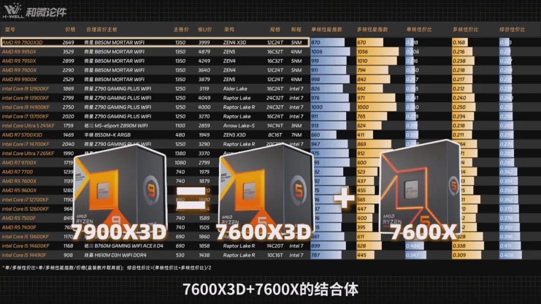 7900X3D,本质上也是7600X3D+7600X的结合体,游戏性能打不过7800X3D,甚至曾经价格与7800X3D出现过一段时间的倒挂都没人买,现在价格比7800X3D还高了,更不值得购买了。