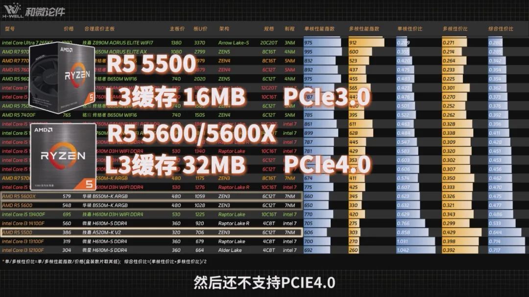 接下来看5600、5600X与5500,看似他们仨核心线程数一样,但是里面的差别可大了,5500相比5600与5600X,砍掉了一半的三级缓存,游戏性能先弱一大截。然后还不支持PCIE4.0,导致它的定位比较尬尴,那些最适合它这个价位CPU的显卡,诸如6500XT、6650XT这类的,PCIE通道都是4.0X4或者X8,与5500搭配,降速到3.0,性能跑不满。我唯一能想到的它的用途就是办公,搞一张亮机卡。5600X,目前跟5600有30元左右的差价,从过性价比指数可以判断出,5600X略高一筹,更推荐5600X。