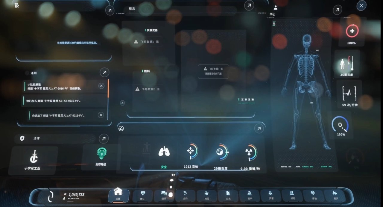 由于《星际公民》高度拟真,“接取任务、好友组队、设置航线”……等诸如此类的游戏菜单功能也被实体化,集成到了一条角色所佩戴的智能手环上。