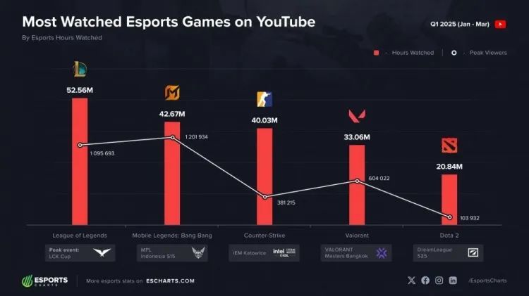 庞大的玩家基数又催生出高度专业、生态丰富的电竞赛事体系。《决胜巅峰》如今已和全球200多支战队建立合作关系,培养职业电竞选手超500名,平均每年在全世界各地主办的赛事不低于600场。据Esports Charts统计,2025第一季度油管观看时长TOP5的电竞游戏,《决胜巅峰》以4267万小时的成绩排名第二,高于《CS2》《无畏契约》《DOTA2》,仅次于《英雄联盟》。