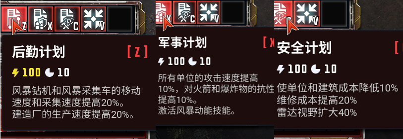 王朝的基地拥有三种计划模式,三选一获得额外BUFF,扩张选后勤、打架选军事、防守选安全。主要建筑都可以升级,获得额外的强化和buff。