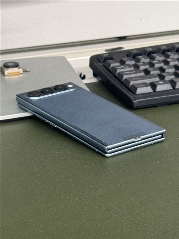 這款三摺疊屏採用“G”字型摺疊方案,左右兩塊屏幕向中間摺疊,這與華爲Mate XT非凡大師的摺疊方案截然不同,後者採用“S”型摺疊方案。