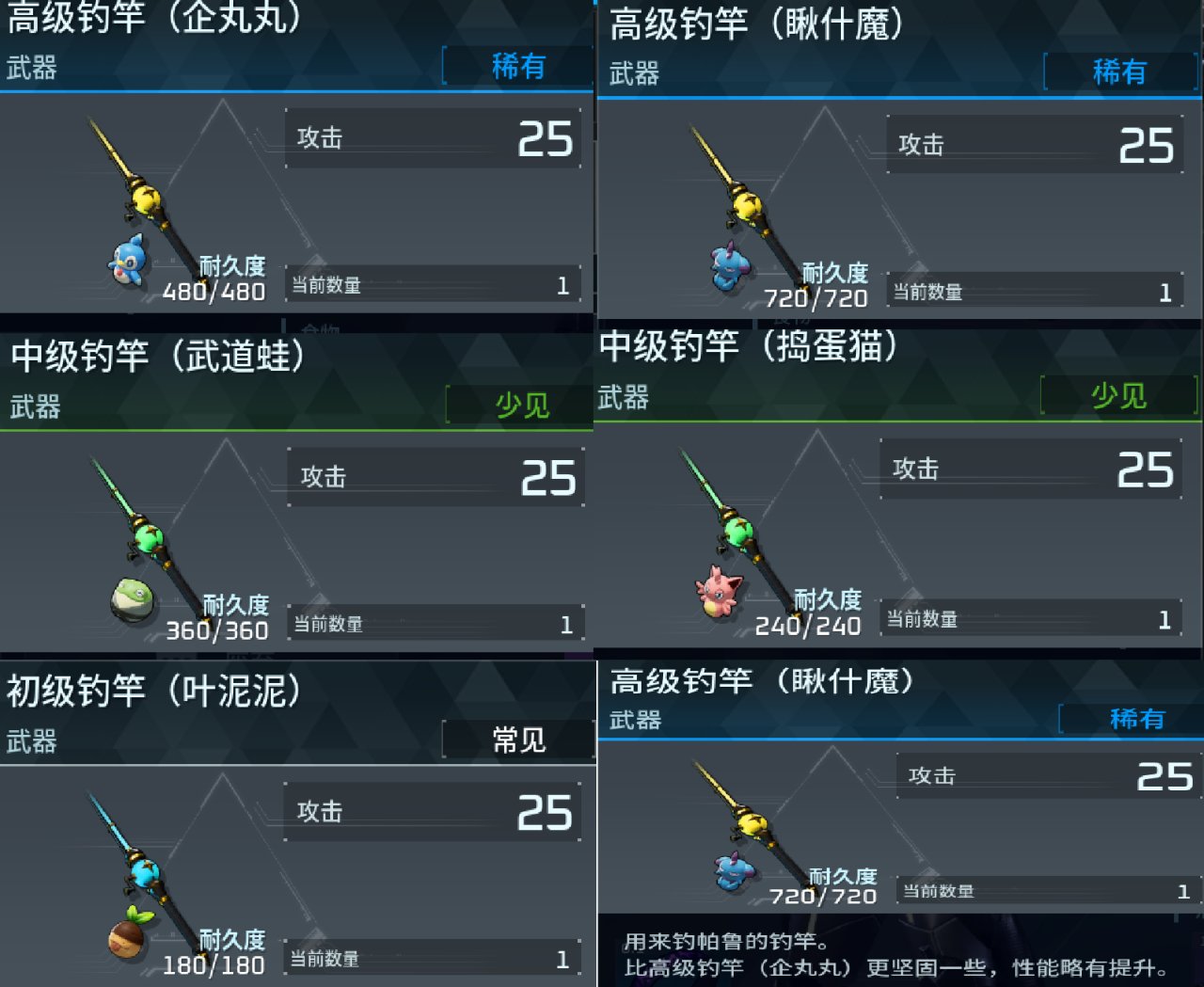 各种不同帕鲁挂饰的鱼竿。钓鱼区域的环境,会影响钓上鱼的属性。