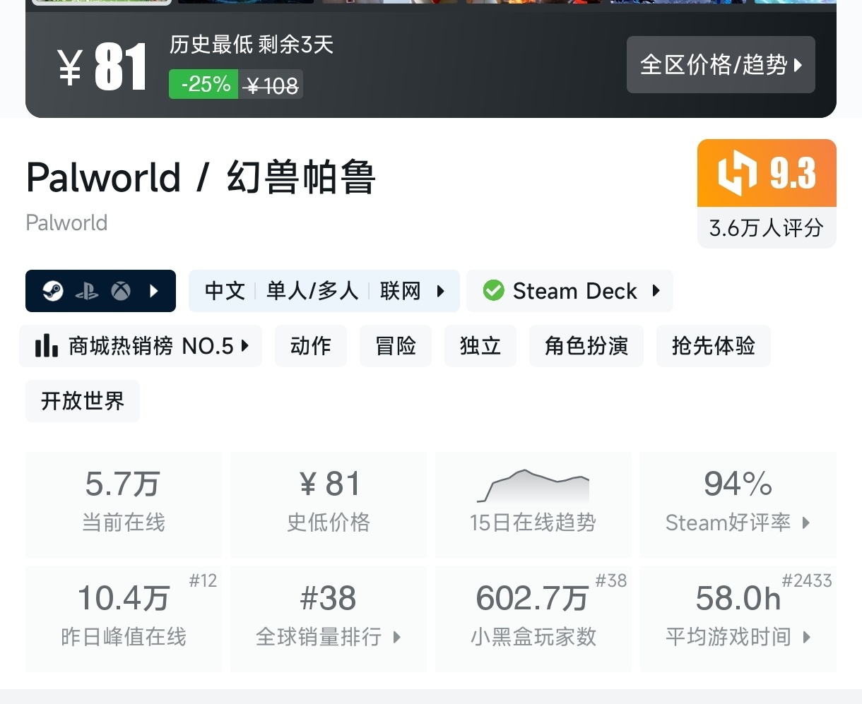 首日销量破200万,Steam在线玩家峰值210万,首月全平台总玩家数破2500万,《幻兽帕鲁》成为了2024年开年的爆款游戏,让“下一款宝可梦游戏何必是宝可梦”变成了现实。