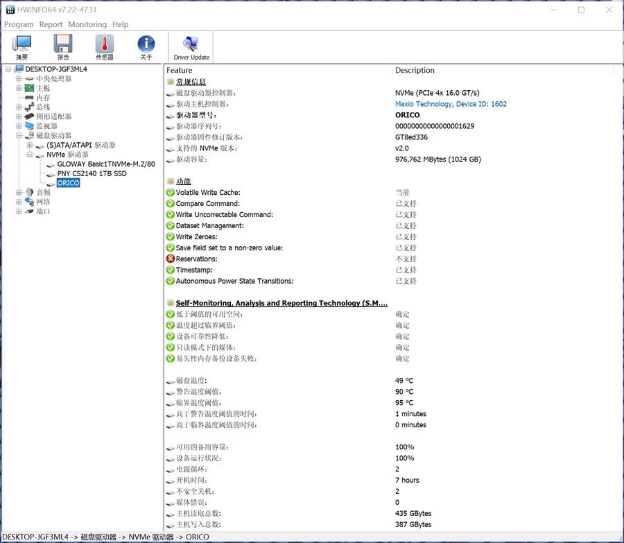 透过HWiNFO64显示磁盘温度:警告温度阈值设定在了90度,临界温度阈值在95度。接下来进行读写测试,看看具体负载温度是多少?